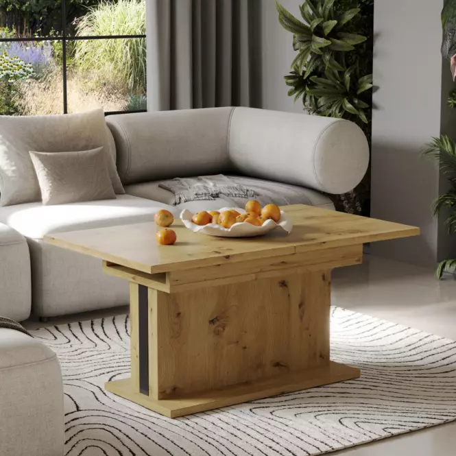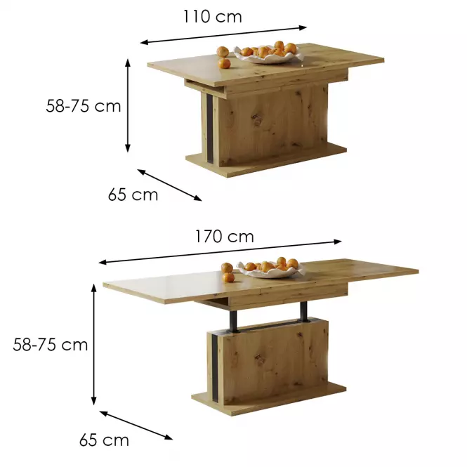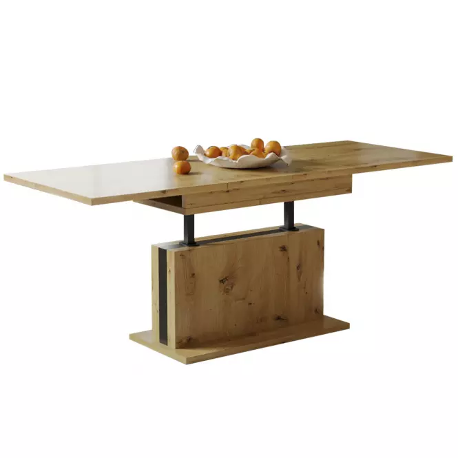 Ławostół rozkładany Solaris 170 dąb artisan to stylowy i nowoczesny mebel, który doskonale łączy funkcjonalność z estetyką, oferując niezwykłą wszechstronność w każdym wnętrzu. Dzięki możliwości rozłożenia oraz regulacji wysokości blatu, Solaris 170 idealnie sprawdzi się zarówno w salonie, jak i jadalni, zapewniając wygodne miejsce do codziennego użytku, a także do przyjmowania gości.