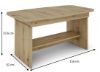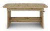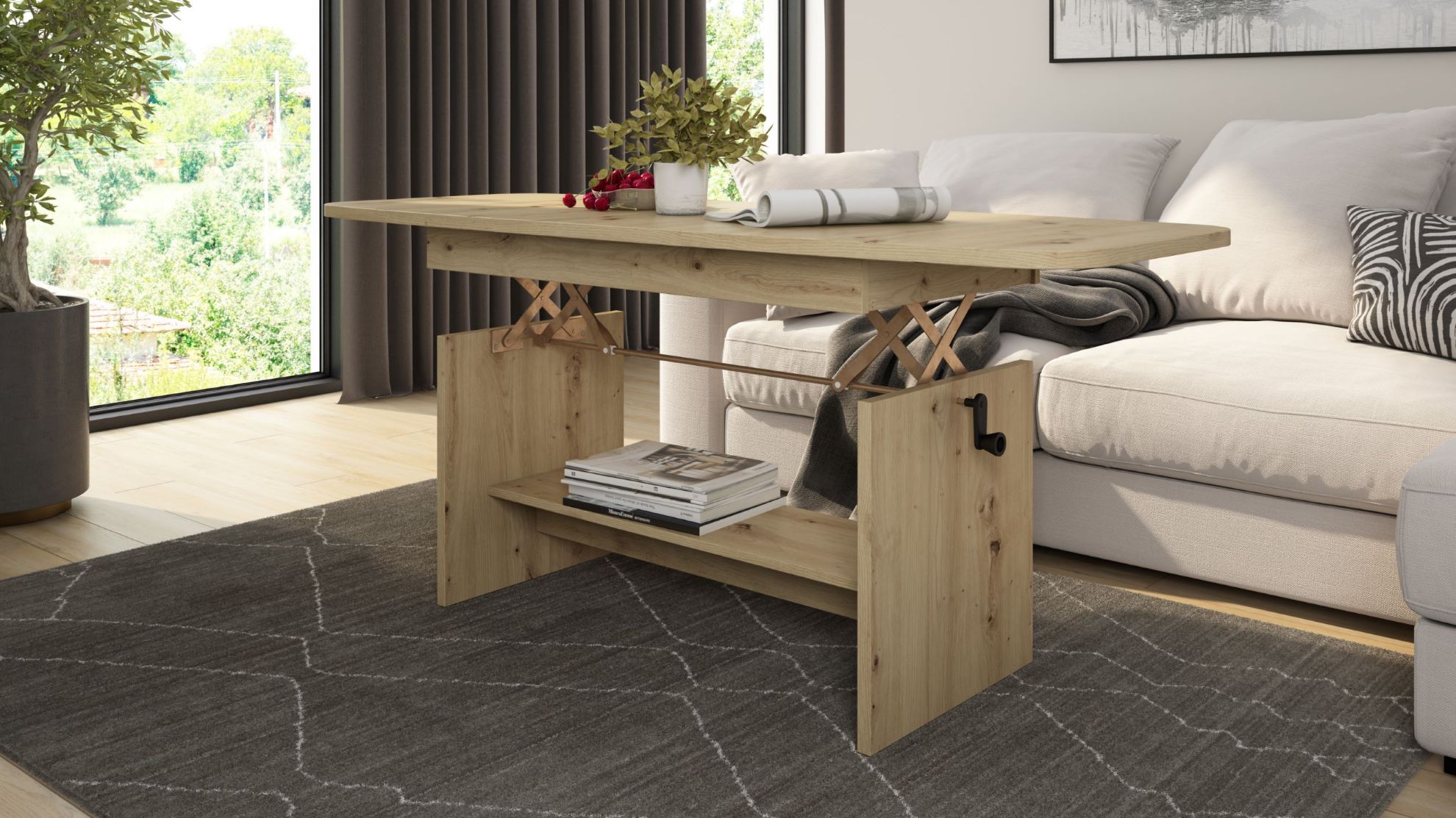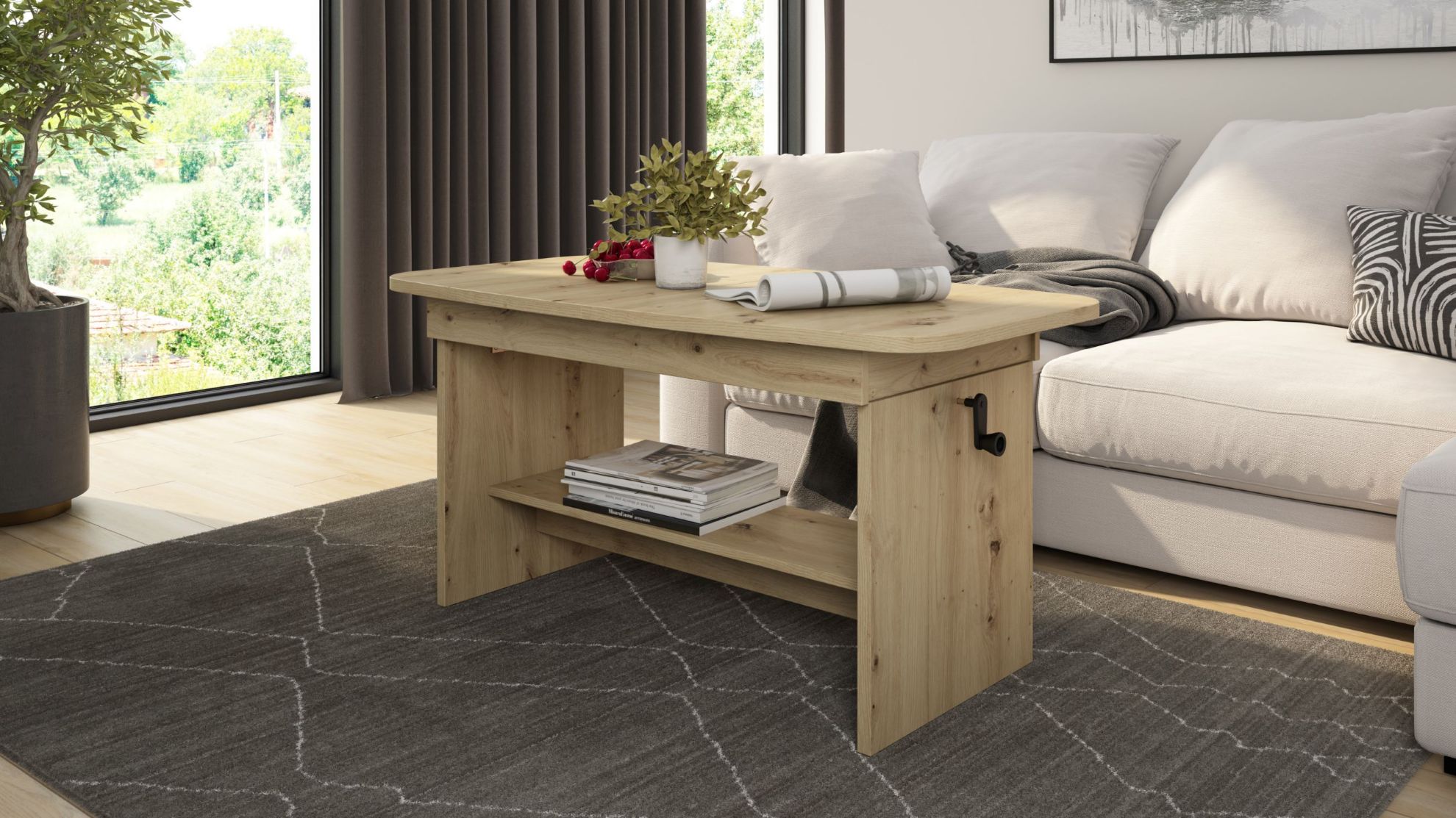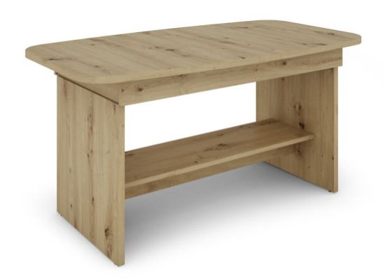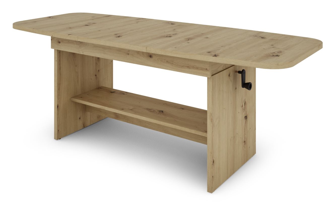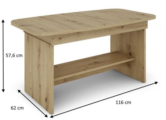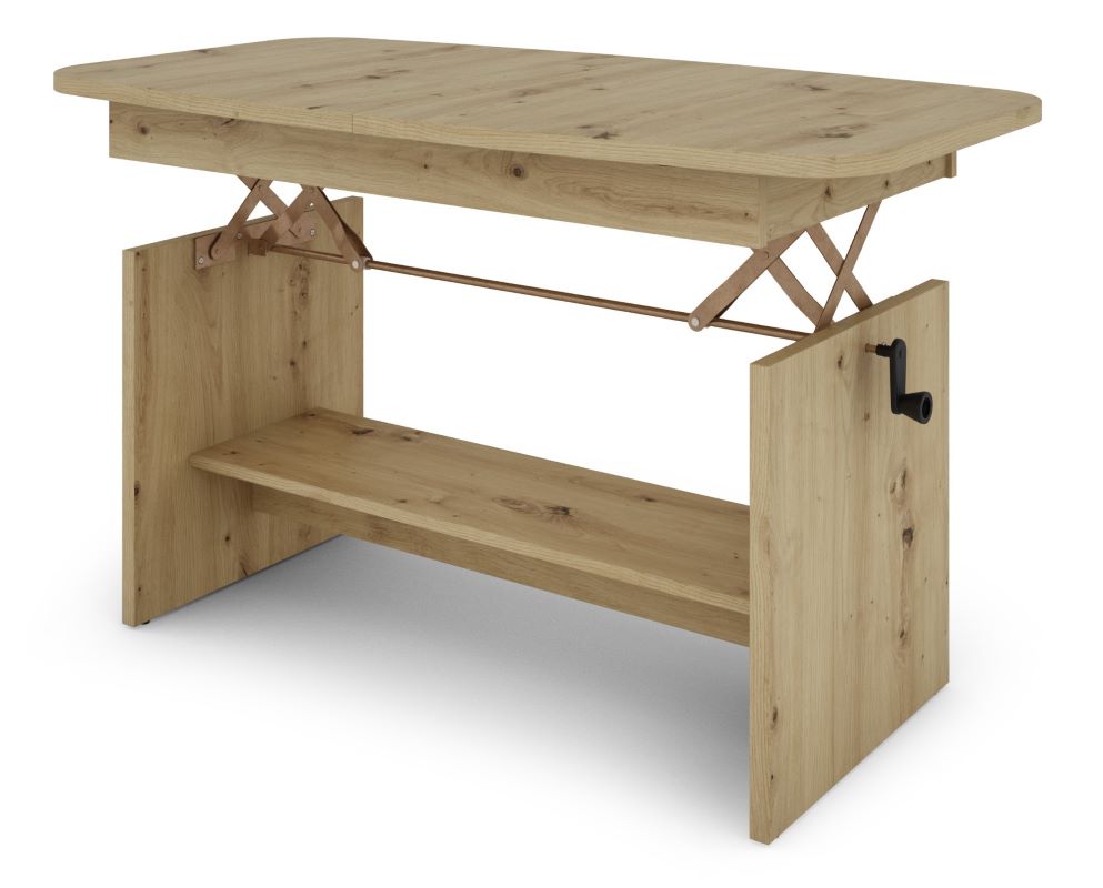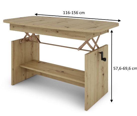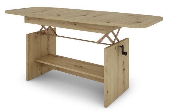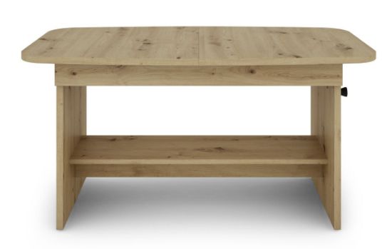 Ławostół Sky dostępny w kolorze dąb artisan. Konstrukcja blatu i nóg z płyty wiórowej laminowanej 22 mm. Ławostół wyposażony w dodatkową wstawkę (40 cm) chowaną pod blatem. Mechanizm rozkładania na metalowych prowadnicach. Dlugość blatu po rozłożeniu wynosi 156 cm. Ławostół z metalowym mechanizmem podnoszenia blatu - maksymalna wysokość 69,6 cm. Mebel wyposażony w pojedynczą półkę.