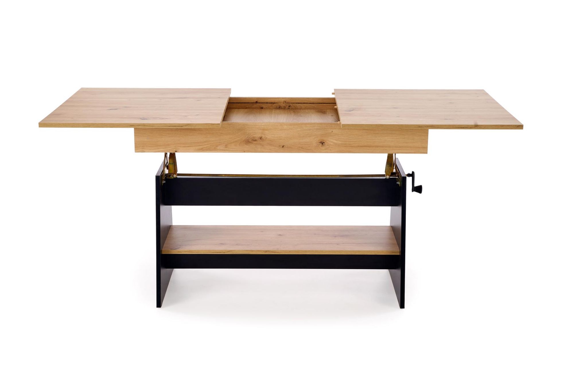 Ławostół Vero dąb artisan/czarny został wyposażony w funkcjonalną półkę pod blatem, która umożliwia wygodne przechowywanie czasopism, pilotów, książek lub innych podręcznych przedmiotów. Takie rozwiązanie pozwala utrzymać porządek w strefie wypoczynkowej oraz zwiększa komfort codziennego korzystania z mebla. Do produkcji wykorzystano płytę meblową laminowaną, która wyróżnia się odpornością na zarysowania, wilgoć oraz wysoką temperaturę, co przekłada się na trwałość i estetyczny wygląd przez długi czas użytkowania. Ławostół Vero rozkładany w kolorze dąb artisan/czarny to doskonały wybór dla osób poszukujących nowoczesnego ławostołu z regulacją wysokości, który łączy estetykę drewna z elegancją czarnych akcentów i sprawdzi się w wielu aranżacjach wnętrz.