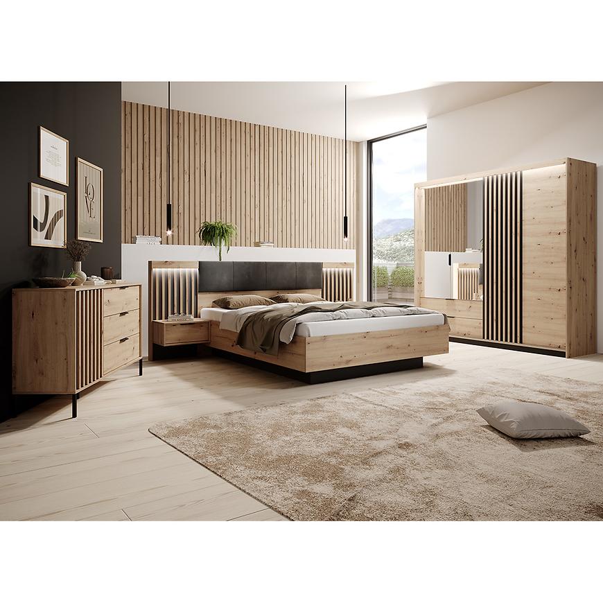 W skład sypialni Tally wchodzi wiele praktycznych elementów, które pomogą w organizacji przestrzeni sypialni. Komoda z trzema szufladami i szafką zapewnia dużo miejsca na przechowywanie odzieży i akcesoriów, podczas gdy czterodrzwiowa szafa oferuje dodatkowe miejsce na ubrania, dzięki drążkowi na ubrania, półkom oraz dwóm szufladom. Opcjonalne oświetlenie LED dodatkowo podkreśla elegancję kolekcji.