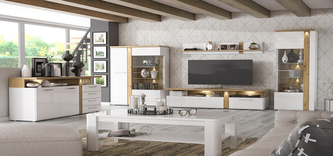 Szafa dwudrzwiowa oferuje dużą przestrzeń na odzież, a szafka RTV z dwoma półkami i szufladą to doskonałe miejsce na sprzęt elektroniczny i multimedia, zachowując jednocześnie schludny wygląd pomieszczenia. Witryny z kolekcji Trondheim, zarówno niska, jak i wysoka, z częściowo przeszklonymi drzwiami, pozwalają na eksponowanie dekoracji czy kolekcji, jednocześnie zapewniając miejsce do przechowywania innych przedmiotów.
