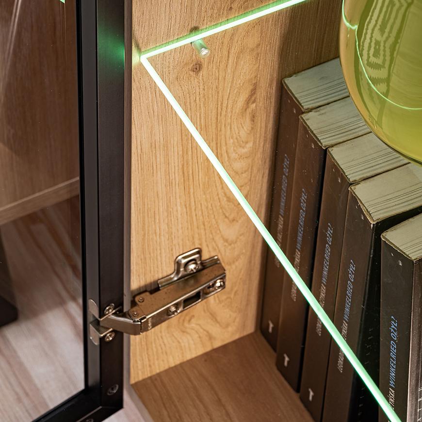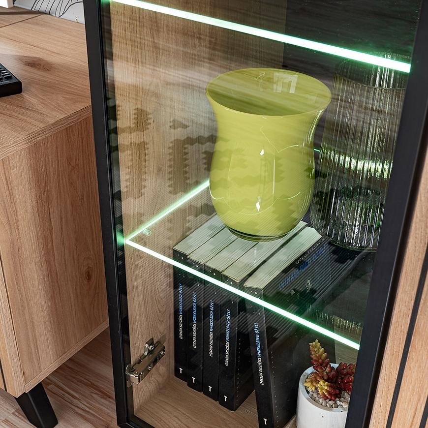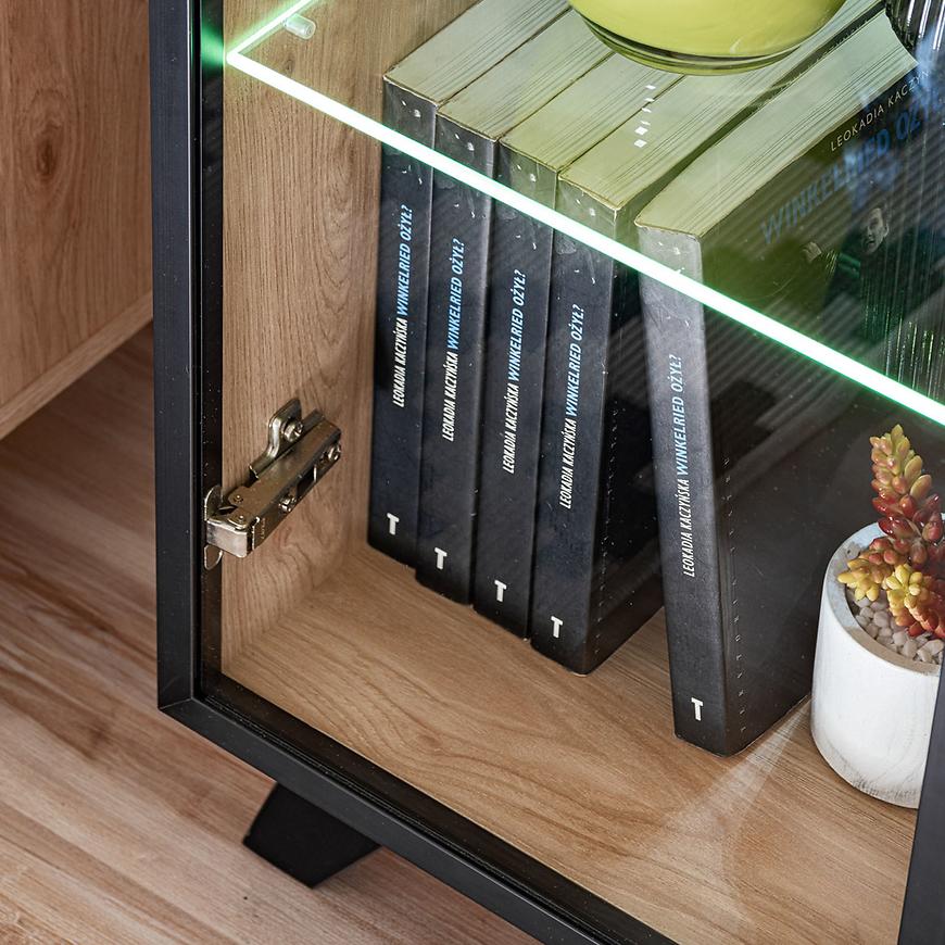 Witryna niska HJZ LM WSW wyposażona jest w szklane drzwi z czarną aluminiową ramą, które nadają jej wyjątkowego charakteru. Za drzwiami znajdują się dwie szklane półki, które są podświetlone białym oświetleniem LED, tworząc niesamowity efekt wizualny. To oświetlenie nadaje witrynie wyjątkowej atmosfery i podkreśla piękno przechowywanych w niej przedmiotów.
