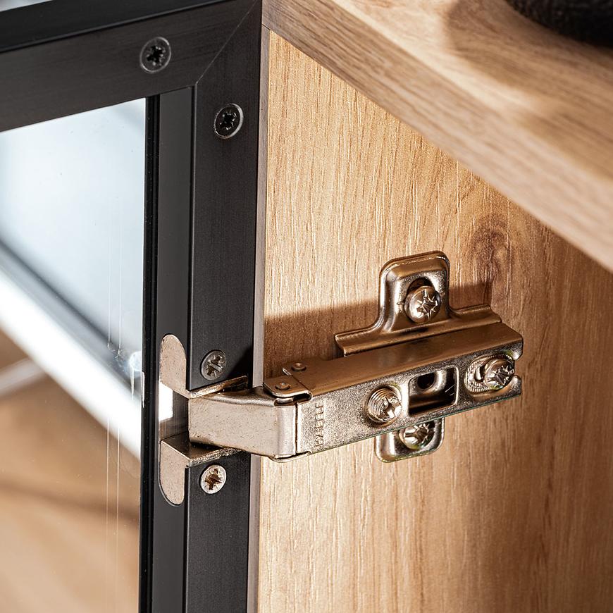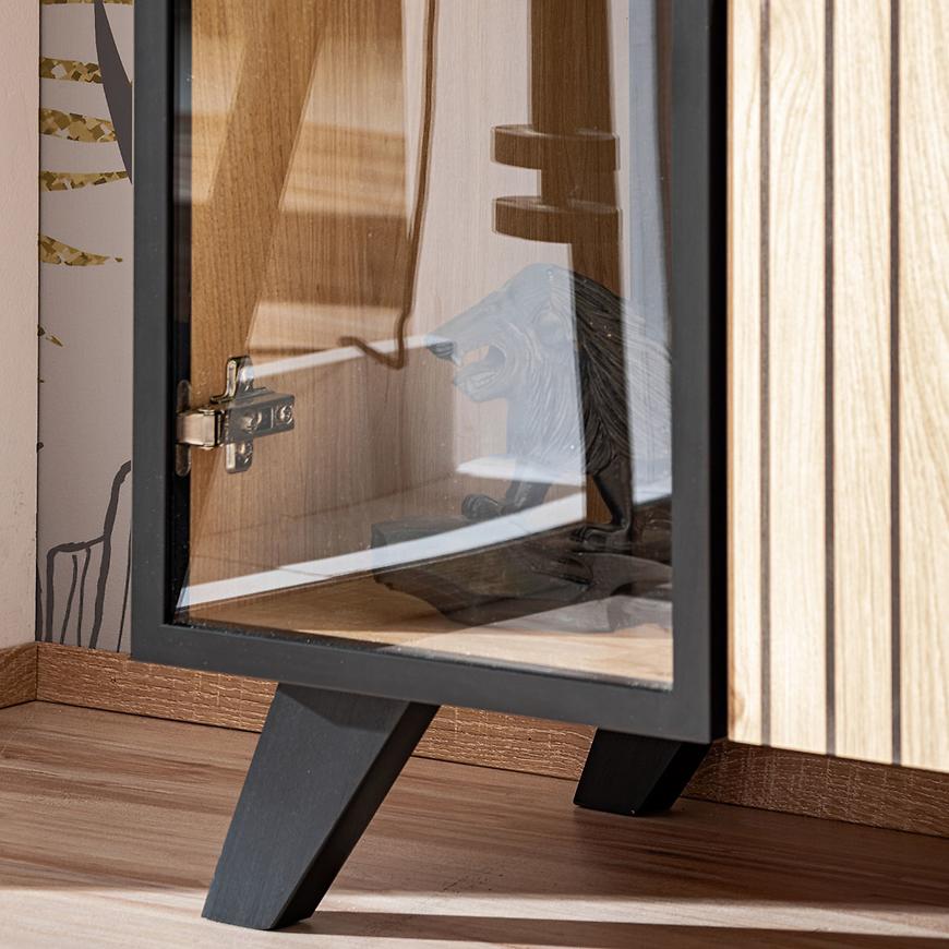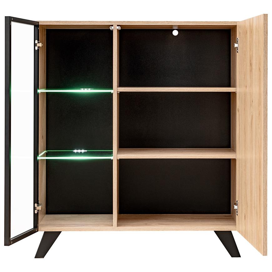 Wewnątrz witryny znajdują się dwie zwykłe półki, które pozwalają na przechowywanie różnych rzeczy, od dekoracji po książki. Drewniane czarne nóżki dodają witrynie elegancji i stabilności. System push-click ułatwia otwieranie i zamykanie drzwi, co sprawia, że korzystanie z mebla jest wyjątkowo wygodne.