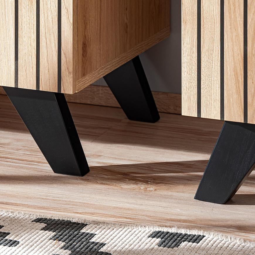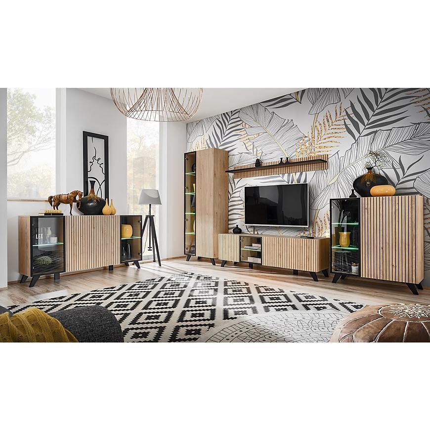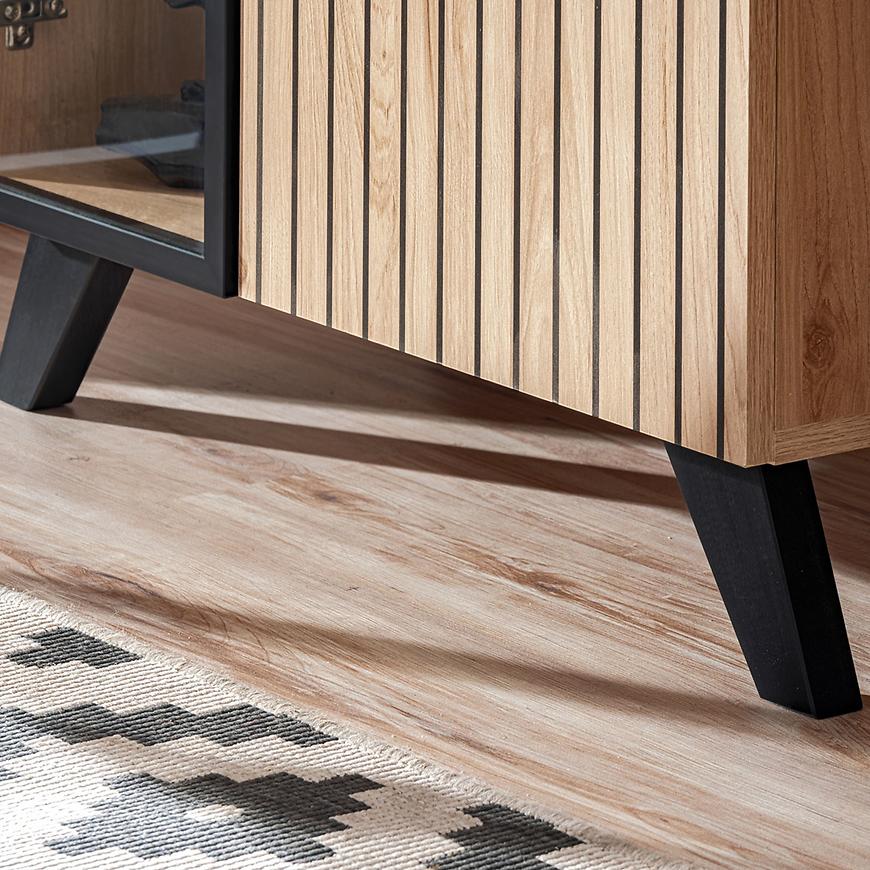 Witryna Niska w kolorze Hickory Jackson/Czarny to mebel, który łączy nowoczesny design z funkcjonalnością i elegancją. Jej matowe wykończenie frontów i korpusu nadaje jej elegancki, minimalistyczny charakter. Zarówno fronty, jak i korpus zostały wykonane z trwałej płyty wiórowej laminowanej.