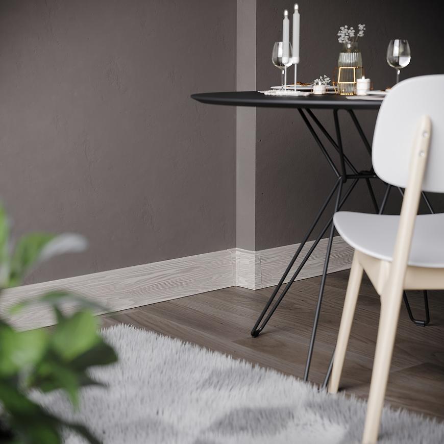 Listwa przypodłogowa PCV wyróżnia się jednolitą, gładką strukturą, która nadaje jej nowoczesny i elegancki wygląd. Wysoki profil tej listwy zapewnia dużo miejsca na ukrycie okablowania, co sprawia, że jest idealnym rozwiązaniem w pomieszczeniach, gdzie dba się o porządek i estetykę. Niezależnie od tego, czy jest to salon, biuro czy sypialnia, listwa ta doskonale spełni swoją rolę.