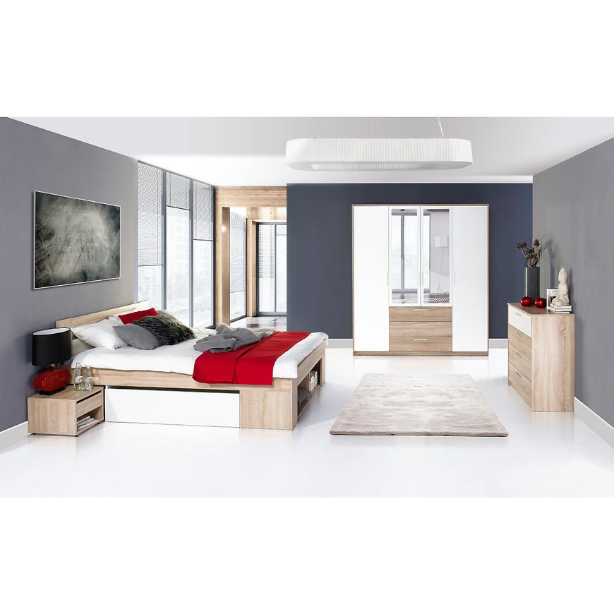 Łóżko 160 z kolekcji MILO w kolorze dąb sonoma i białym to nowoczesny mebel wykonany z laminowanej płyty wiórowej, z matowym wykończeniem. Jego wymiary to 80 cm wysokości, 172 cm szerokości i 206 cm głębokości, powierzchnia spania wynosi 160x200 cm. W komplecie znajdują się dwie szafki nocne i dwie szuflady, tył zagłowia wykonano z płyty MDF. Łóżko nie posiada materaca ani stelaża w zestawie, nie jest tapicerowane i nie oferuje oświetlenia. Posiada schowek na pościel, wymaga samodzielnego montażu, a jego waga wynosi 89 kg.