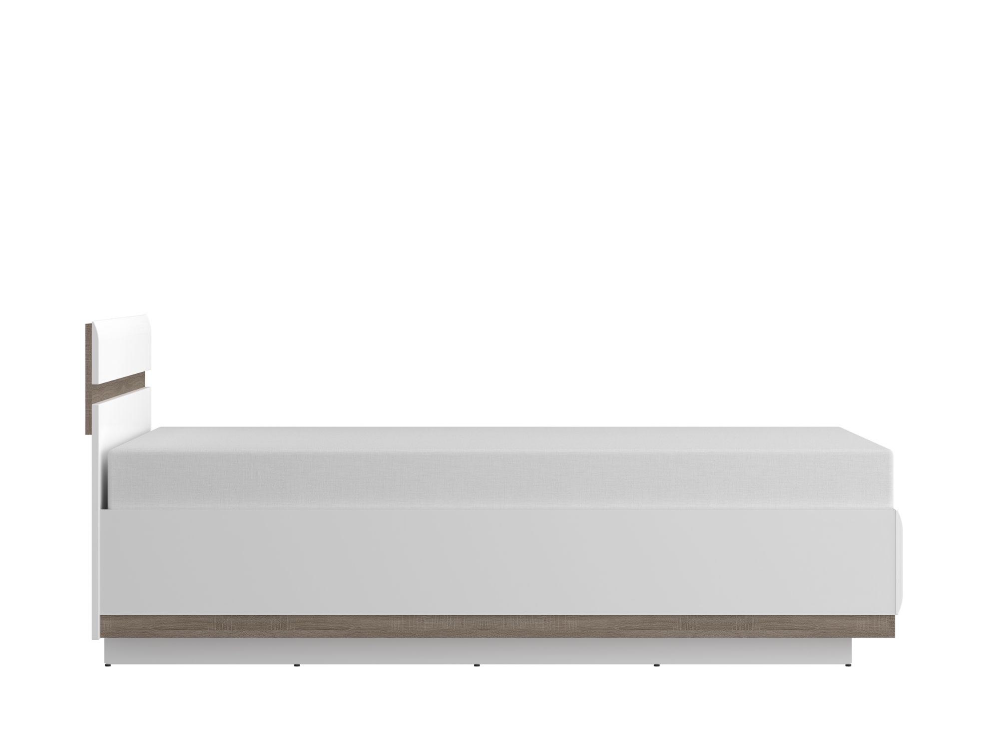 Korpus łóżka wykonano z wytrzymałej płyty wiórowej laminowanej, a ozdobne szczyty z trwałej płyty MDF. Dodatkowo, istnieje możliwość montażu opcjonalnego oświetlenia LED typu Butterfly lub Flexi w zagłówku – to rozwiązanie nie tylko podnosi komfort użytkowania po zmroku, ale też dodaje wnętrzu wyjątkowego klimatu.