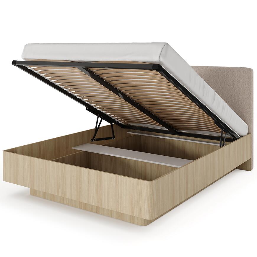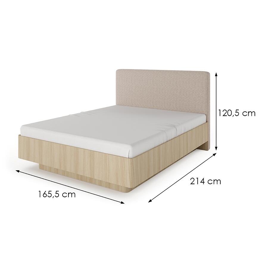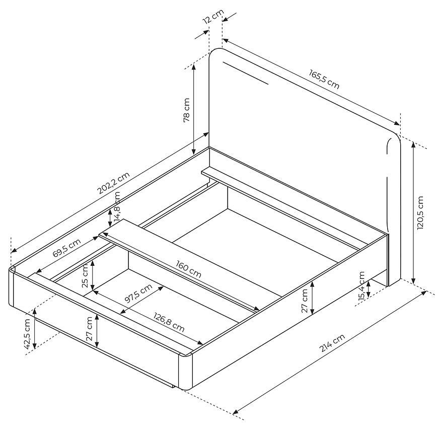 Wymiary łóżka to wysokość 120,5 cm, szerokość 165,5 cm i głębokość 214 cm, co pozwala na dopasowanie do różnych przestrzeni sypialnianych. Łóżko wyposażone jest w pojemnik na pościel o wymiarze 202,2 cm, który umożliwia wygodne przechowywanie pościeli i utrzymanie porządku.