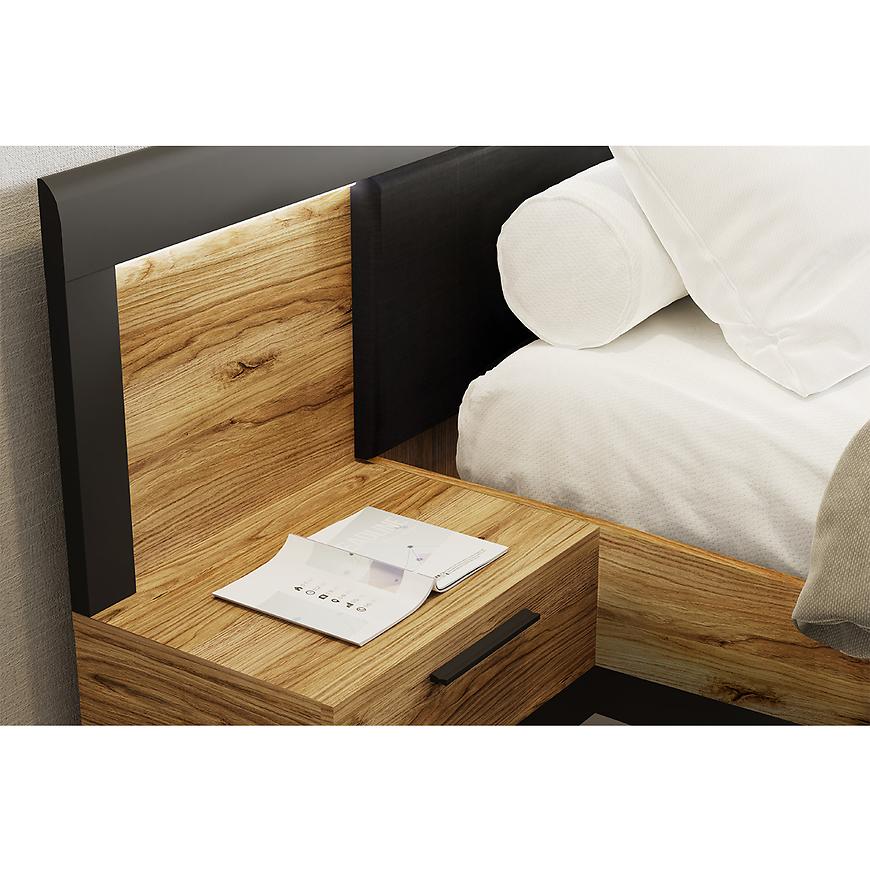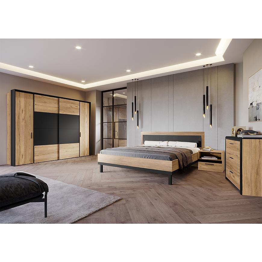 Dekor w odcieniu dąb catania z elementami w czarnym kolorze nadaje meblom niezwykłego charakteru. Fronty i korpusy mebli zostały wykończone matowym lakierem, co nadaje im delikatnego wyglądu i zapewnia trwałość. Ten minimalistyczny, ale stylowy wybór pozwala na łatwe wkomponowanie mebli Nemezy w różne aranżacje wnętrz sypialni.