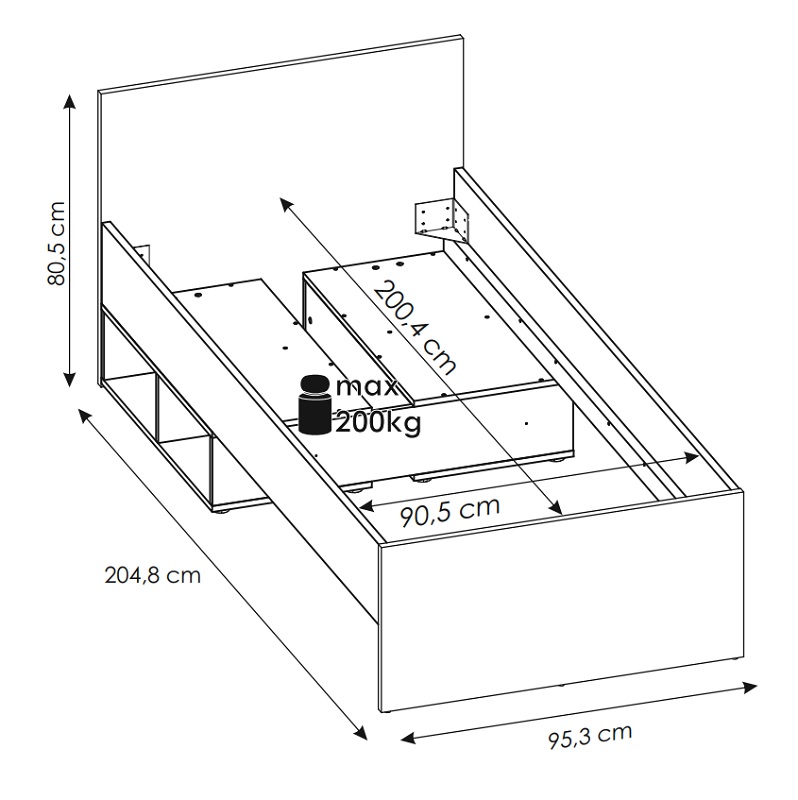 Łóżko ma szerokość 95,3 cm, wysokość 80,5 cm i głębokość 204,8 cm, zapewniając wygodne miejsce do spania dla jednej osoby. Jego minimalistyczny i nowoczesny design pozwala łatwo dopasować łóżko do różnych aranżacji wnętrza.