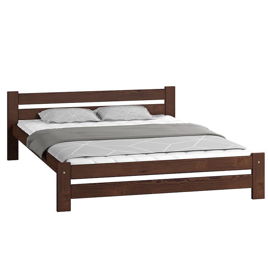 Wybarwienie orzech w ciemnym tonie nadaje łóżku wyrazisty, elegancki charakter. Prosty zagłówek bez zdobień utrzymuje spójny, nowoczesny design.