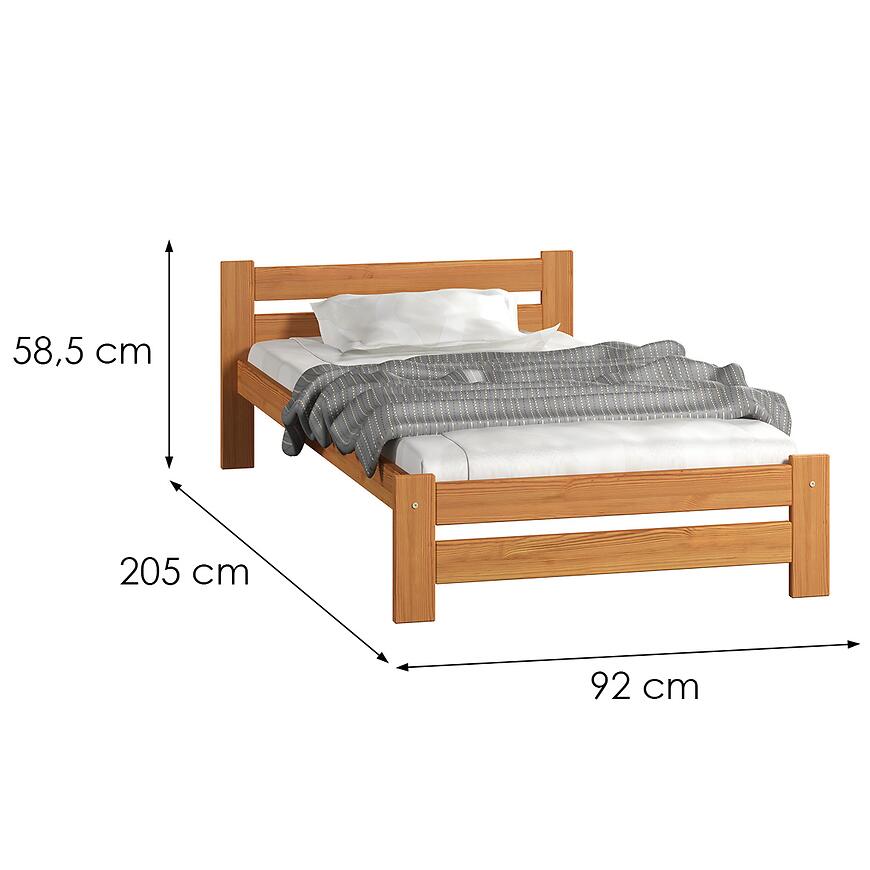 Model wykonany z drewna wyróżnia się stabilnością i trwałością. Wymiary 92 cm szerokości, 205 cm długości i 58,5 cm wysokości sprawiają, że łóżko zachowuje lekką wizualnie formę, jednocześnie oferując pełną funkcjonalność.