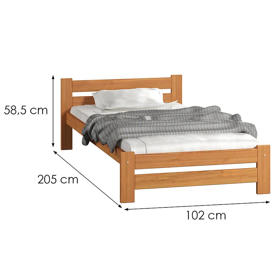 Model wykonany z drewna wyróżnia się stabilnością i trwałością. Wymiary 102 cm szerokości, 205 cm długości i 58,5 cm wysokości sprawiają, że łóżko zachowuje lekką, nowoczesną formę przy jednoczesnej funkcjonalności.