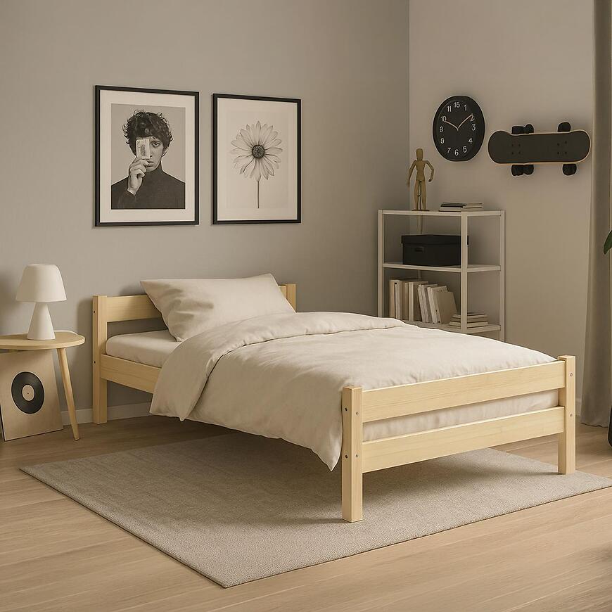 Łóżko Aleks naturalne, nielakierowane z kolekcji ALEKS to funkcjonalne łóżko drewniane 200x80, które łączy minimalistyczną formę z naturalnym wyglądem drewna. Jasne, drewnopodobne wybarwienie oraz matowe wykończenie podkreślają strukturę materiału i sprawiają, że mebel doskonale wpisuje się w nowoczesne, skandynawskie oraz minimalistyczne wnętrza. Naturalny kolor pozwala na łatwe dopasowanie łóżka do różnych aranżacji sypialni, pokoju młodzieżowego czy dziecięcego.