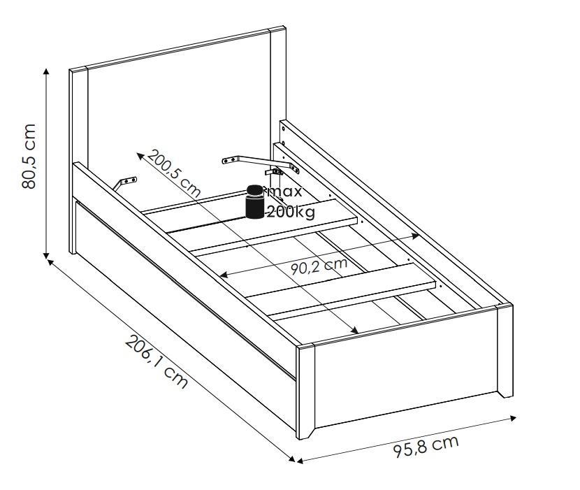 Łóżko Angel Typ 90 o wymiarach 95,8 cm szerokości, 80,5 cm wysokości i 206,1 cm głębokości oferuje komfortowe miejsce do snu dla jednej osoby. Dzięki kompaktowym wymiarom sprawdzi się idealnie w pokojach dziecięcych, młodzieżowych lub niewielkich sypialniach.