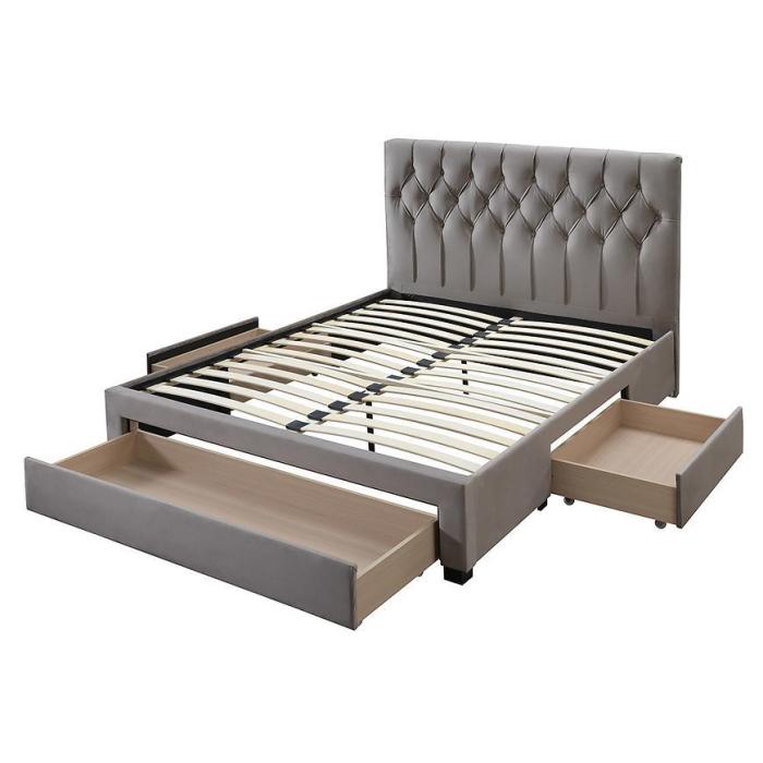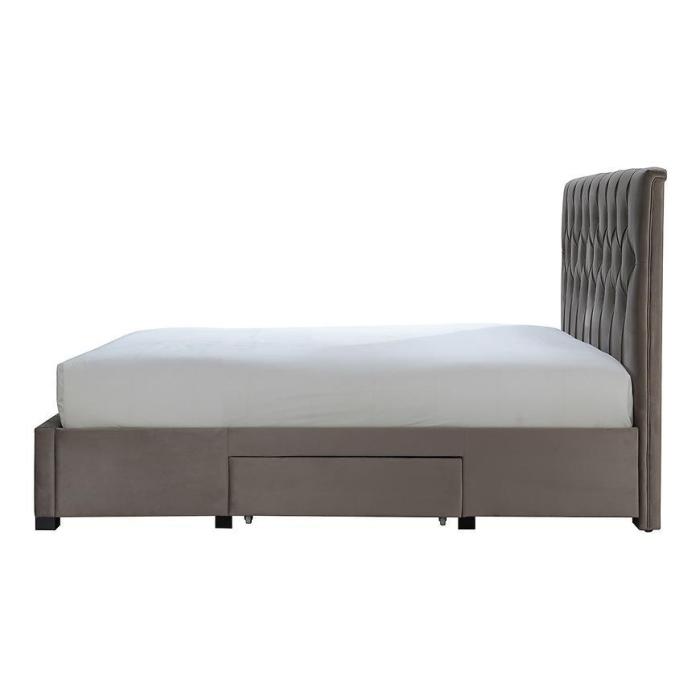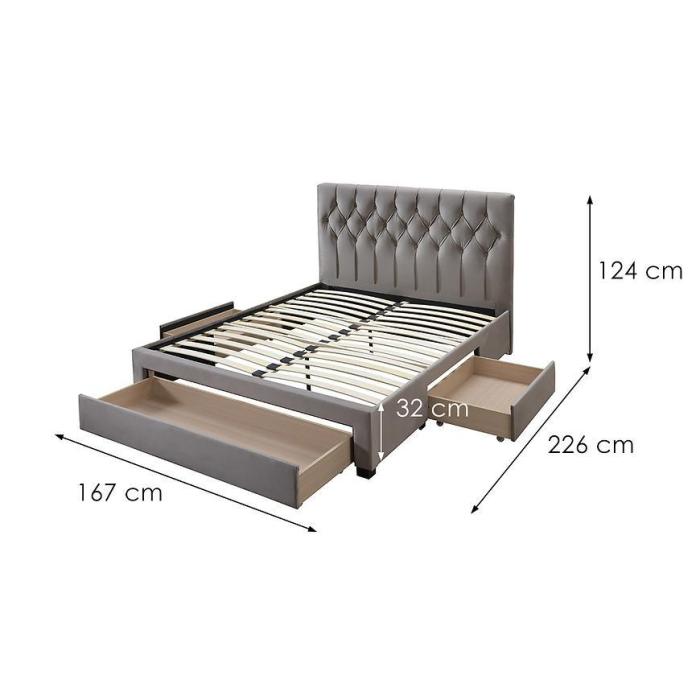 Łóżko Arturo o wymiarach 167x226 zostało wykonane w stylu nowoczesnym z płyty wiórowej laminowanej. Łóżko tapicerowane jest tkaniną w kolorze szarym. Będzie pasować do większości aranżacji. Drewniane nóżki w kolorze wenge dodatkowo podkreślają charakter łóżka. Mebel posiada szuflady, do których można schować koce czy poduszki.