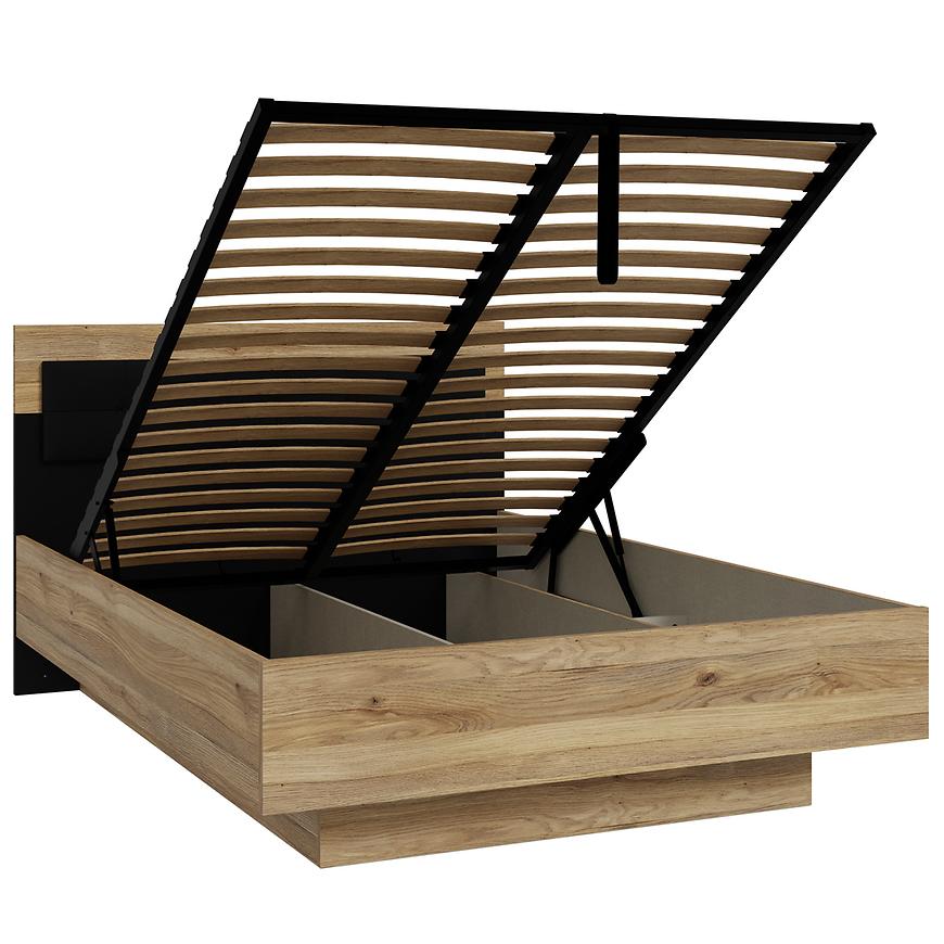 Korpus łóżka wykonano z płyty wiórowej laminowanej, co gwarantuje trwałość i stabilność konstrukcji. Naturalne wybarwienie dąb Mauvella w połączeniu z czarnymi akcentami doskonale wpisuje się w aktualne trendy wnętrzarskie – pasuje zarówno do nowoczesnych, jak i loftowych sypialni.