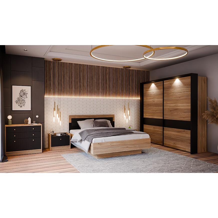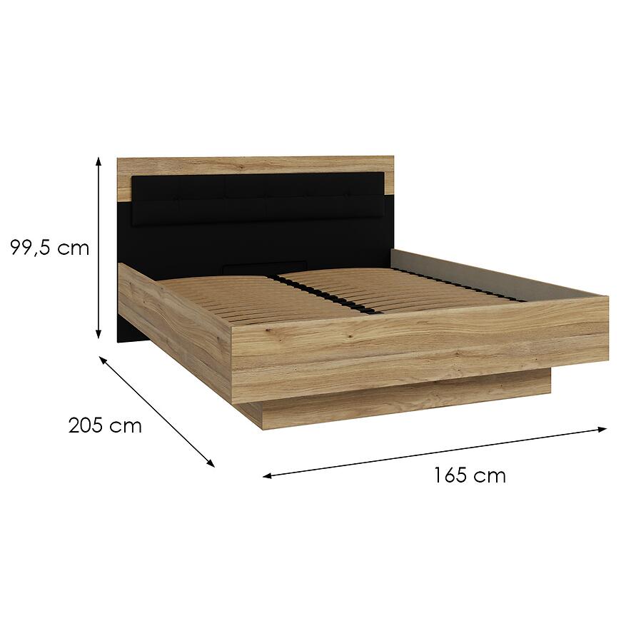 Korpus łóżka wykonany z płyty wiórowej laminowanej zapewnia stabilność i długowieczność użytkowania. Jasne drewnopodobne wybarwienie w kolorze dąb Mauvella dodaje wnętrzu ciepła, a czarne detale podkreślają nowoczesny charakter mebla. To idealne połączenie funkcjonalności i estetyki.