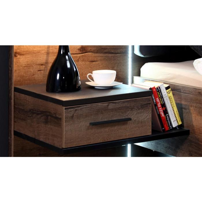 W kolekcji znajduje się również łóżko, które jest prawdziwą ozdobą sypialni. Wyposażone jest w podwieszane szafki nocne, które zapewniają dogodne miejsce na przechowywanie przedmiotów codziennego użytku. Łóżko dostępne jest w dwóch rozmiarach - 180x200 cm i 160x200 cm, a sprzedawane jest bez materaca oraz stelaża, dając swobodę w wyborze tych elementów. Zagłówek tapicerowany ekoskórą w eleganckim czarnym kolorze dodaje meblom wyjątkowego charakteru, jednocześnie zapewniając wygodne oparcie podczas czytania czy oglądania telewizji.