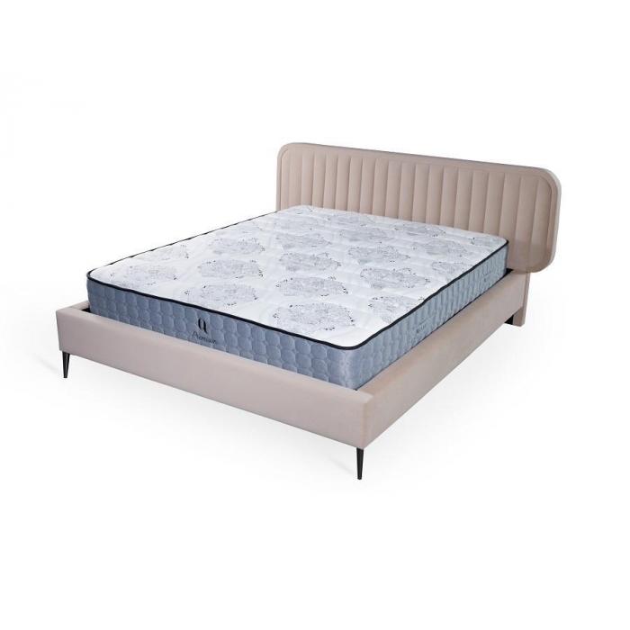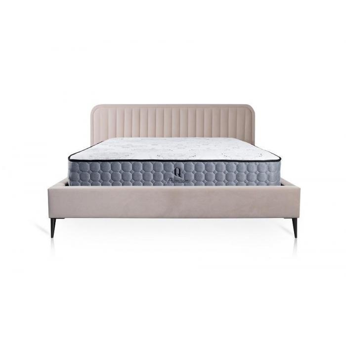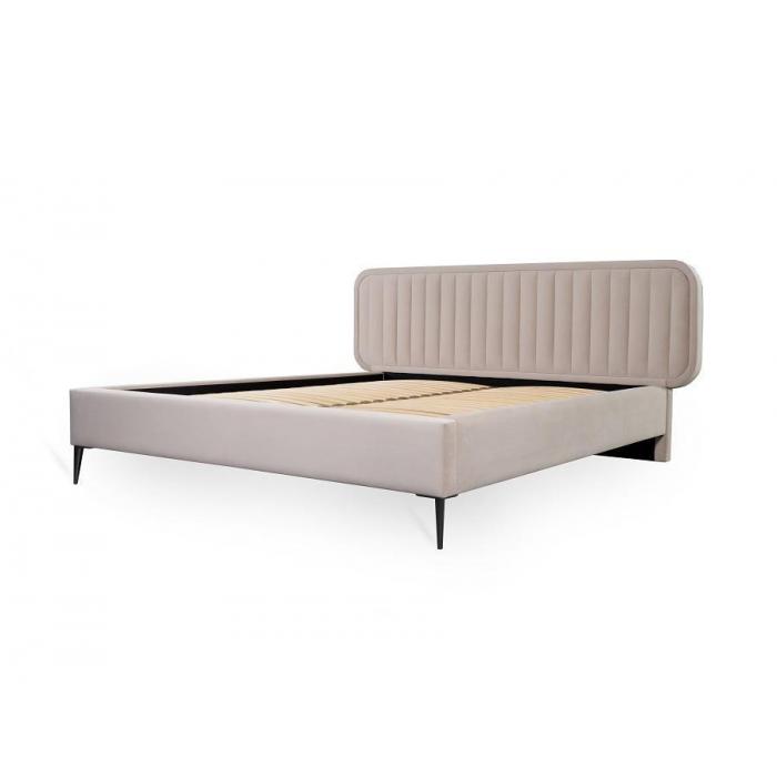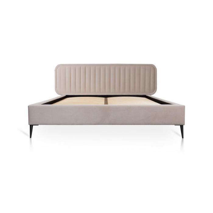Zagłówek łóżka jest zaokrąglony i tworzy ramę, która została wypełniona puszystą włókniną i pokryta miękkką, welwetową tkaniną z przyszyciami, które wykonał automat szyjący. Zastosowana tkanina jest odporna na wchłanianie płynów i łatwo usunąć z niej zabrudzenia, dzięki czemu zostanie zachowana czystość łóżka podczas codziennego użytkowania. Dodatkowo, tkanina jest odporna na ścieranie oraz pormieniowanie UV, co sprawia, że łóżko zachowa swój najlepszy wygląd przez długie lata. Całość konstrukcji została umieszczona na wysokich, metalowych nóżkach, które współgrają z całością mebla. Wysokość nóżek wynosi 16cm.