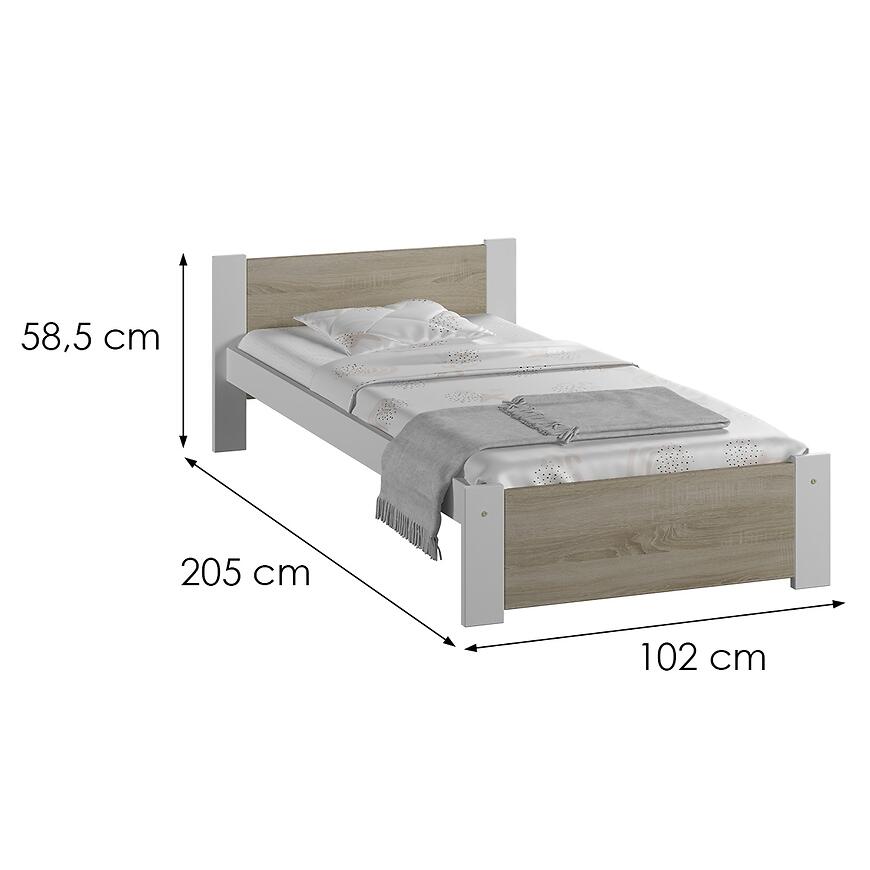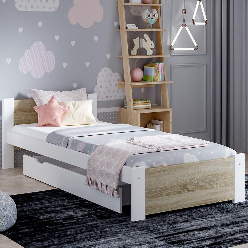 Łóżko Bergen 90 w zestawieniu bieli i dekoru dąb sonoma to propozycja o lekkim, nowoczesnym wyglądzie. Jasna kolorystyka w połączeniu z naturalnym akcentem drewna tworzy spójną i estetyczną całość, która dobrze wpisuje się w aktualne trendy wnętrzarskie.