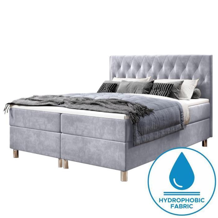 Łóżko kontynentalne Calipso nie tylko spełnia walory estetyczno-wizualne, ale zapewnia także wygodę i komfort podczas użytkowania. Łożko tapicerowane jest aksamitną tkaniną, a dodatkowo lekkości dodają również montowane do bryly chromowane nóżki. Łóżko posiada także dwa pojemniki do przechowywania np. pościeli czy poduszek.