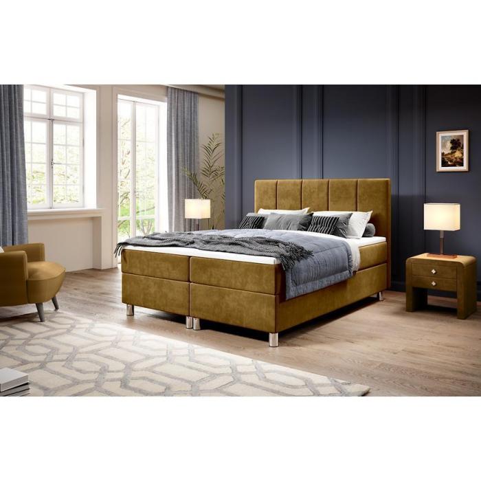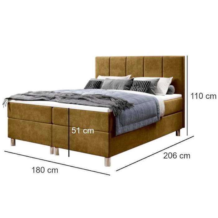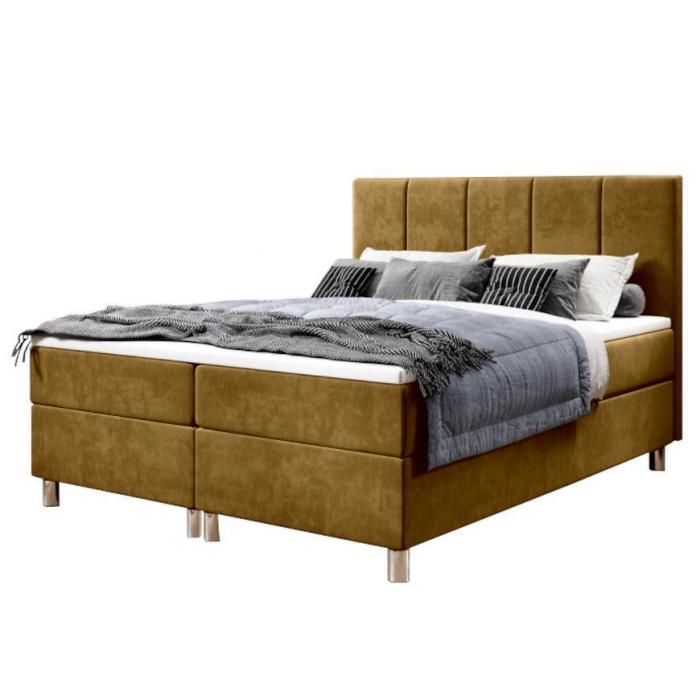 Łóżko kontynentalne Calipso to idealne rozwiązanie dla osób, dla których ważną rolę spełnia zarówno efekt wizualny jak i komfort użytkowania. Łóżko tapicerowane jest aksamitną tkaniną, która jest hydrofobowa. Dodatkową wygodę zapewni bonellowy materac oraz topper. Łóżko zostało wyposażone w dwa pojemniki do przechowywania. Posiada chromowe nóżki.
