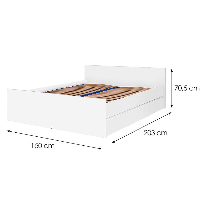Łóżko wykonane z płyty wiórowej laminowanej wyróżnia się trwałością oraz odpornością na codzienne użytkowanie. Wymiary 150 cm szerokości, 203 cm długości i 70,5 cm wysokości tworzą stabilną i proporcjonalną bryłę.