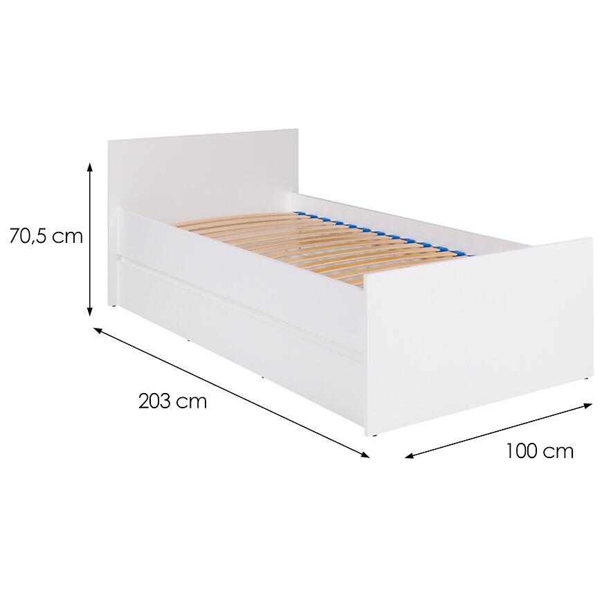 Łóżko wykonane z płyty wiórowej laminowanej cechuje się trwałością i odpornością na użytkowanie. Wymiary 100 cm szerokości, 203 cm długości i 70,5 cm wysokości zapewniają stabilność i odpowiednie proporcje.
