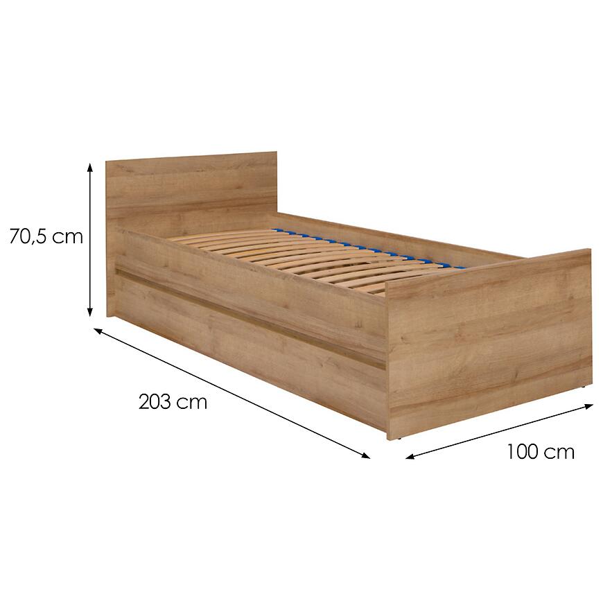 Łóżko wykonane z płyty wiórowej laminowanej jest odporne na codzienne użytkowanie. Wymiary 100 cm szerokości, 203 cm głębokości oraz 70,5 cm wysokości zapewniają stabilność i wygodę. Matowe wykończenie podkreśla nowoczesny charakter mebla.