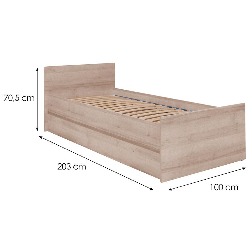 Łóżko wykonane z płyty wiórowej laminowanej cechuje się odpornością na codzienne użytkowanie. Wymiary 100 cm szerokości, 203 cm długości oraz 70,5 cm wysokości zapewniają stabilność oraz wygodę.