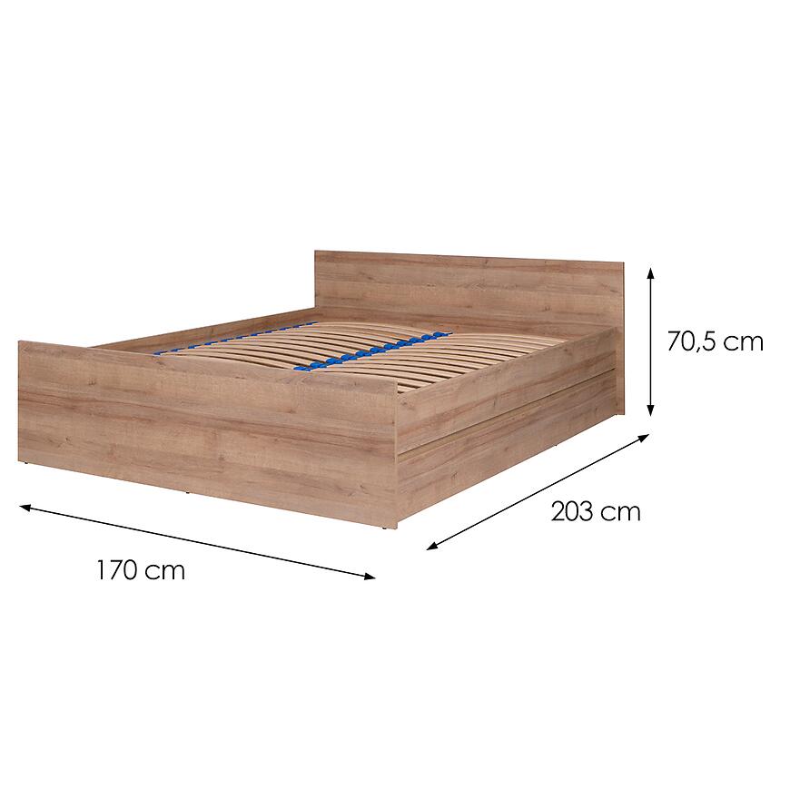 Wykonane z płyty wiórowej laminowanej, łóżko jest odporne na codzienne użytkowanie. Wymiary: 170 cm szerokości, 203 cm głębokości i 70,5 cm wysokości gwarantują stabilność i wygodę. Matowe wykończenie podkreśla nowoczesny charakter mebla.