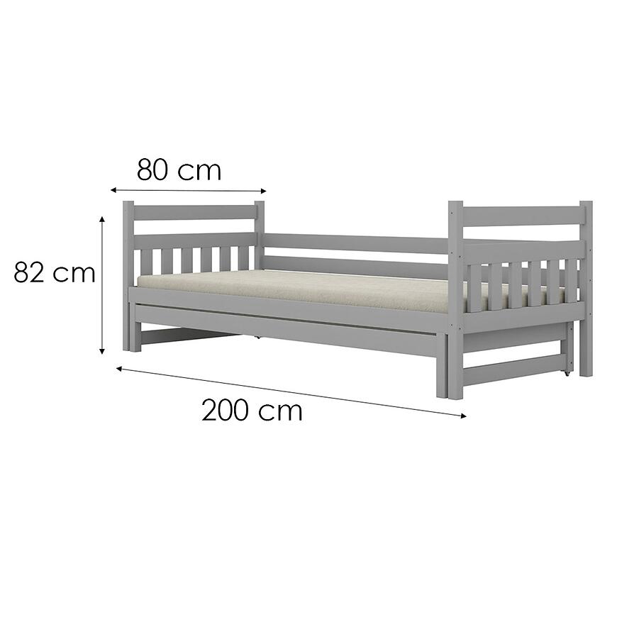 Łóżko oferuje główną powierzchnię spania 200x80 cm oraz wysuwane dodatkowe spanie umieszczone pod stelażem, które można w każdej chwili wysunąć, tworząc dodatkowe miejsce do spania dla gościa. Wymiary stelaża 200x80 cm pozwalają dopasować dowolny materac, a jego solidna konstrukcja gwarantuje stabilność i trwałość na lata. Materac nie jest w zestawie, co umożliwia wybór najlepszego modelu według własnych potrzeb.