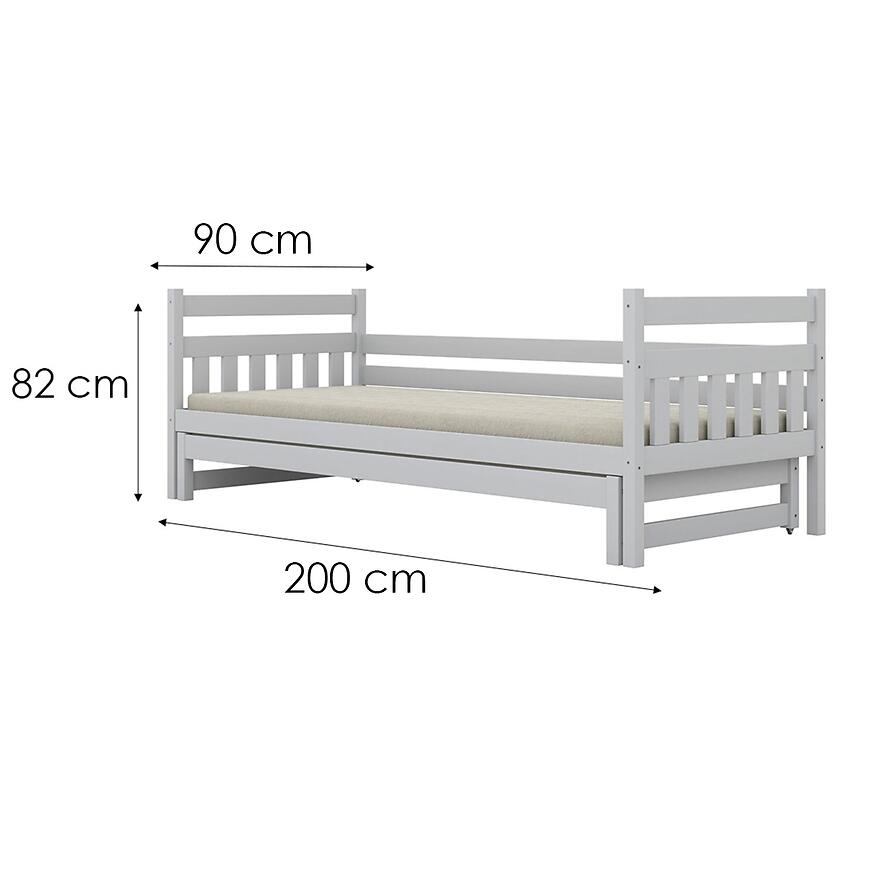 Łóżko oferuje główną powierzchnię spania 200x90 cm oraz wysuwane dodatkowe spanie umieszczone pod stelażem, które można w każdej chwili wysunąć, tworząc dodatkowe miejsce do spania dla gościa. Wymiary stelaża 200x90 cm pozwalają dopasować dowolny materac, a jego solidna konstrukcja gwarantuje stabilność i trwałość na lata. Materac nie jest w zestawie, co pozwala wybrać model idealnie dopasowany do własnych potrzeb.