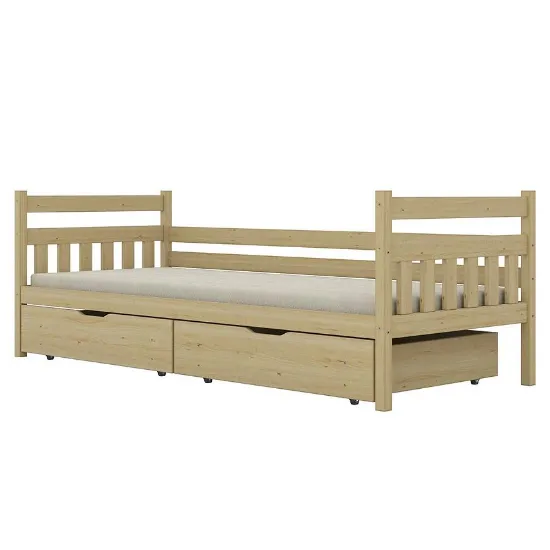 Łóżko wykonane jest z drewna w naturalnym kolorze, nielakierowanego, z matowym wykończeniem. Naturalna struktura drewna podkreśla jego walory estetyczne, a solidna konstrukcja zapewnia stabilność i komfort codziennego użytkowania.