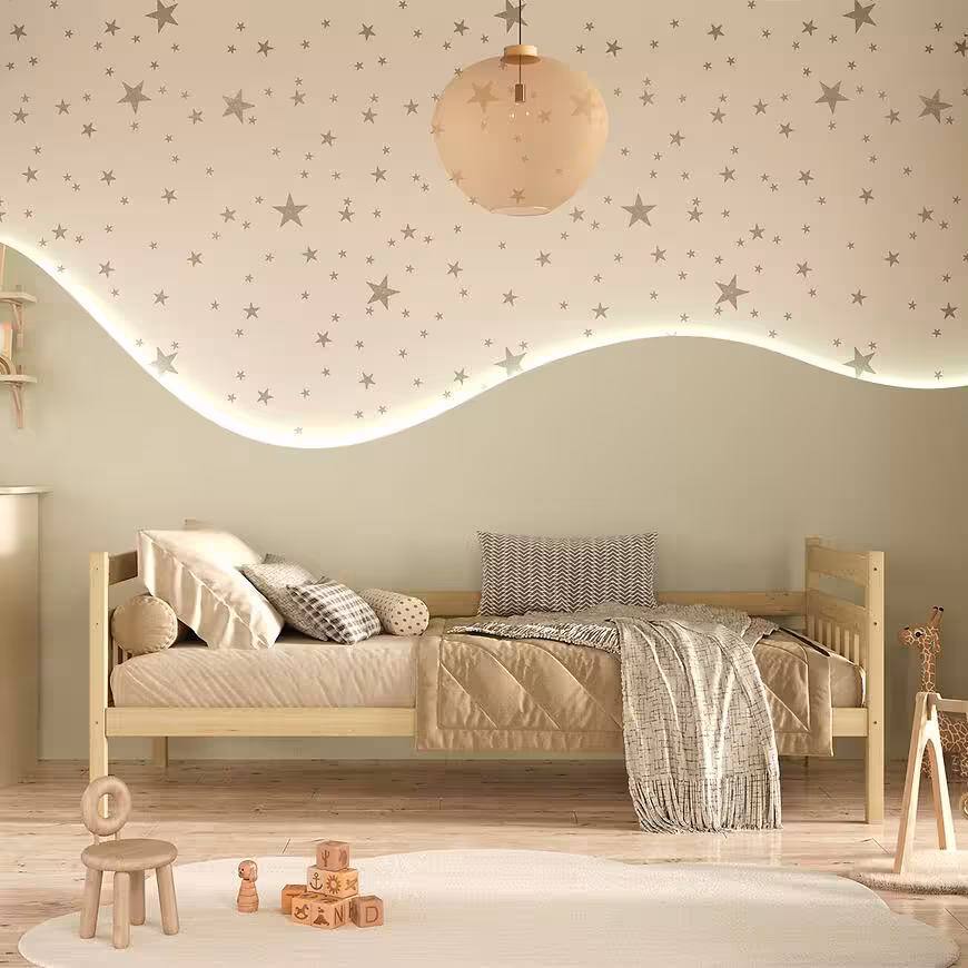 Łóżko Dawid standard 200x90 cm to funkcjonalne łóżko jednoosobowe z drewnianą konstrukcją i stelażem w zestawie. Brak schowka na pościel sprawia, że bryła pozostaje lekka wizualnie i minimalistyczna, co ułatwia aranżację wnętrza. Otwarta przestrzeń pod łóżkiem umożliwia swobodne utrzymanie porządku lub wykorzystanie miejsca na dodatkowe pojemniki.