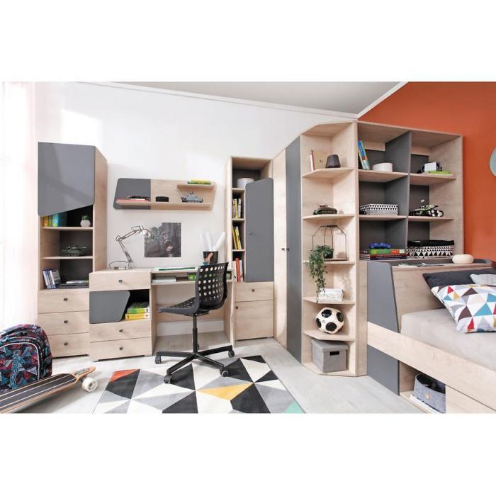 Półki ścienne wiszące to nie tylko praktyczne miejsce na ekspozycję ulubionych dekoracji, ale także element wzmacniający charakter pokoju młodzieżowego. Biurko z szufladami i półką pod klawiaturę to ergonomiczne miejsce do nauki i pracy, doskonale wpisujące się w estetykę kolekcji.