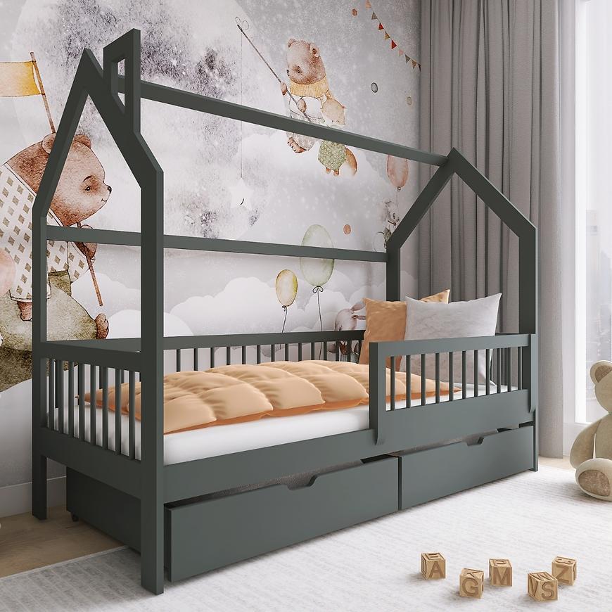Łóżko Domek Oskar 80x160 graphite to wyjątkowy mebel, który łączy funkcjonalność, estetykę i zabawny design, tworząc idealne miejsce do snu i zabawy dla dziecka. Zainspirowany kształtem domku, model Oskar doskonale sprawdzi się jako centralny punkt w dziecięcym pokoju, wprowadzając do niego przytulną, domową atmosferę. Jego wysokość zapewnia optymalną przestrzeń do spania, a przy tym nie przytłacza wnętrza, co czyni je idealnym rozwiązaniem zarówno do większych, jak i mniejszych pokoi.