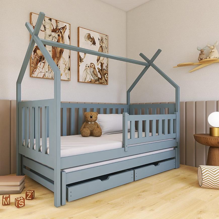 Łóżko Domek Tytus wyposażone jest w praktyczny schowek na pościel, który znajduje się pod powierzchnią spania. Dwa pojemne schowki umożliwiają przechowywanie kołder, poduszek czy innych rzeczy, co ułatwia utrzymanie porządku w pokoju. Dzięki temu łóżko łączy w sobie funkcję spania i przechowywania, co jest szczególnie przydatne w mniejszych pomieszczeniach, gdzie każdy centymetr przestrzeni jest na wagę złota.
