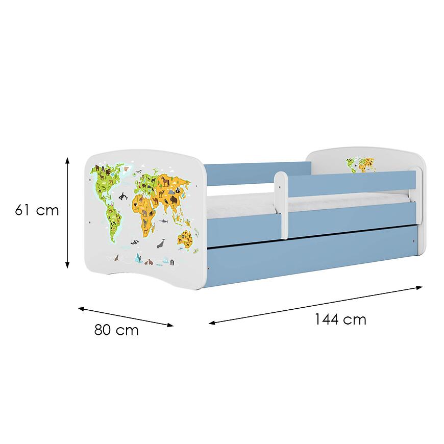 Łóżko dziecięce Babydreams+SZ+M 70x140 mapa niebieskie z materacem i szufladą – funkcjonalne, trwałe łóżko z płyty laminowanej.