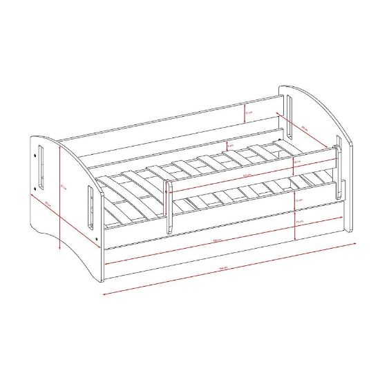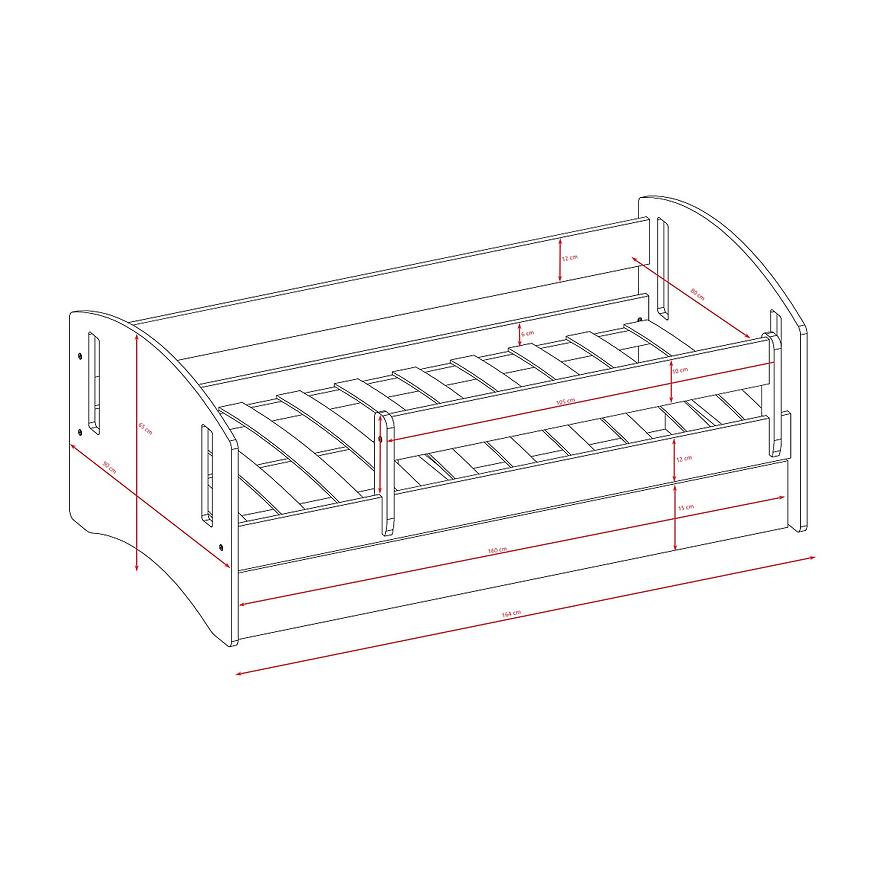 Zaprojektowane z dbałością o detale, łóżko posiada wymiary 65 cm (wysokość), 90 cm (szerokość) oraz 164 cm (głębokość). Komfort spania zapewnia obszerna powierzchnia o wymiarach 80x160 cm. Stelaż w komplecie gwarantuje solidne wsparcie dla malucha podczas snu, a matowe wykończenie nadaje meblowi elegancki i nowoczesny charakter.