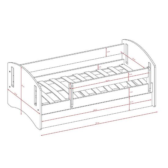 Zaprojektowane z dbałością o detale, łóżko posiada wymiary 65 cm (wysokość), 90 cm (szerokość) oraz 184 cm (głębokość). Komfort spania zapewnia obszerna powierzchnia o wymiarach 80x180 cm. Stelaż w komplecie gwarantuje solidne wsparcie dla malucha podczas snu, a matowe wykończenie nadaje meblowi elegancki i nowoczesny charakter.
