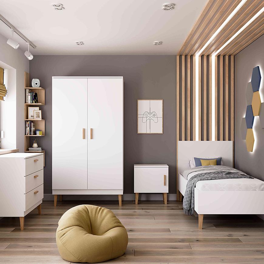 W skład kolekcji wchodzi dwudrzwiowa szafa, pełniąca funkcję pojemnej przestrzeni do przechowywania ubrań i innych przedmiotów. Drzwi uchylne ułatwiają dostęp, a wnętrze szafy zostało zoptymalizowane, aby pomieścić nawet największą ilość rzeczy, utrzymując jednocześnie porządek. Komoda z trzema szufladami to idealne rozwiązanie na przechowywanie drobiazgów, a jednocześnie stanowi elegancką ozdobę pokoju.