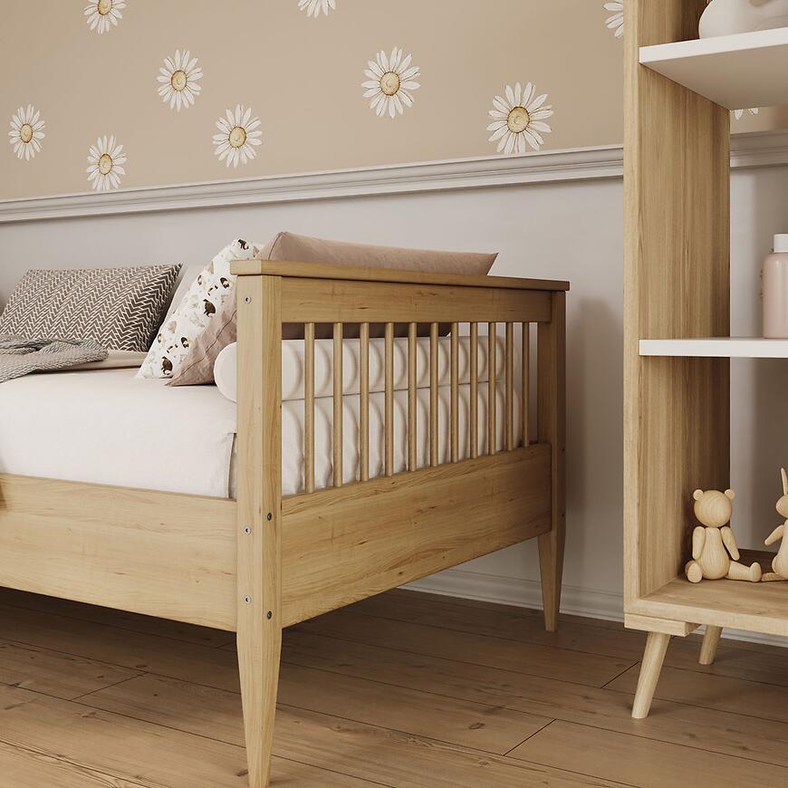 Łóżko Emilia wykonane jest z trwałego drewna, co przekłada się na stabilność oraz długą żywotność mebla. Naturalny kolor i jasne drewnopodobne wybarwienie wprowadzają do wnętrza ciepło oraz przyjemną atmosferę sprzyjającą relaksowi. Matowa powierzchnia prezentuje się estetycznie i harmonijnie komponuje się z jasnymi ścianami, drewnianą podłogą czy białymi dodatkami.