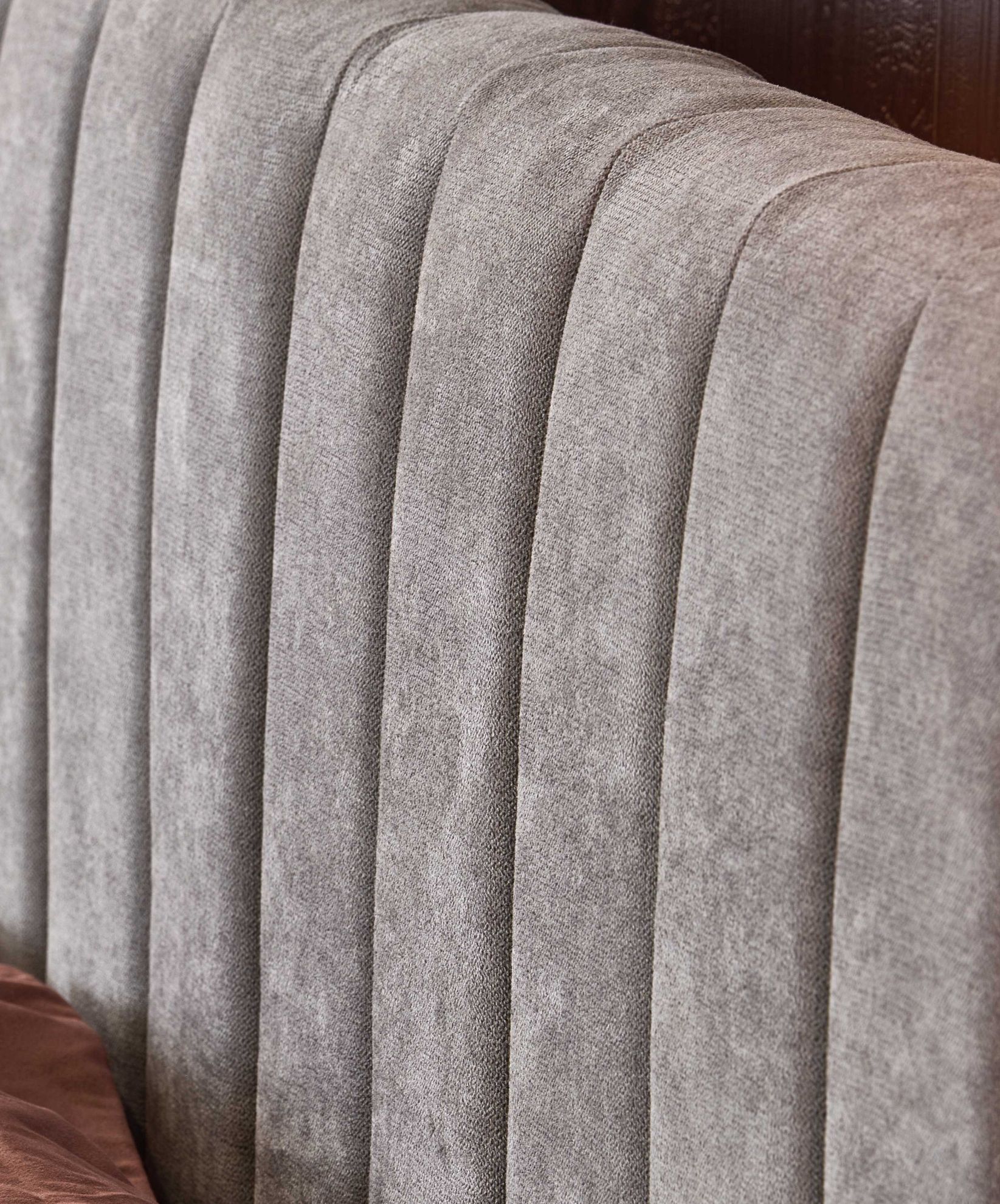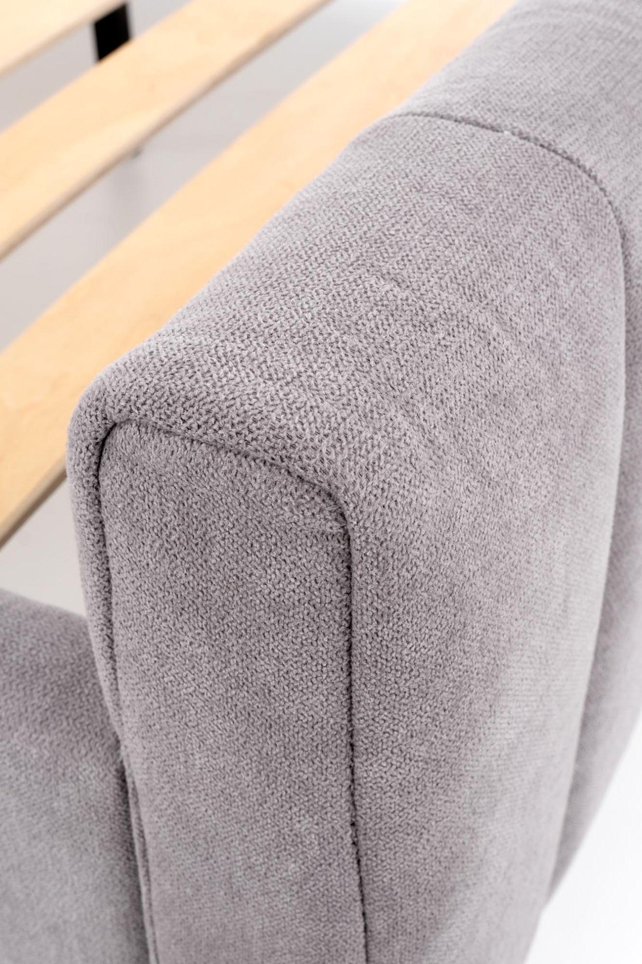 Miękka tkanina w jasnym popielatym kolorze nadaje łóżku Frania subtelny i uniwersalny charakter. To rozwiązanie doskonale komponuje się z różnymi stylami aranżacyjnymi, jednocześnie wprowadzając do sypialni świeżość i lekkość.