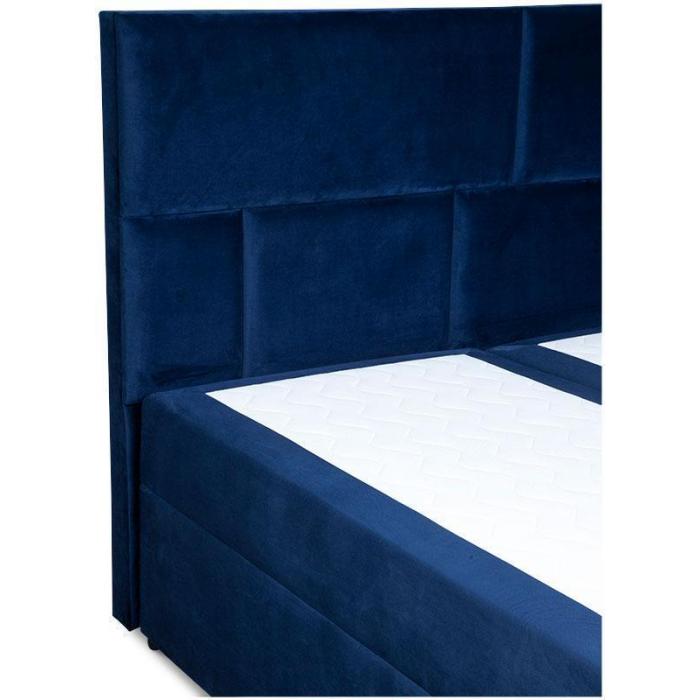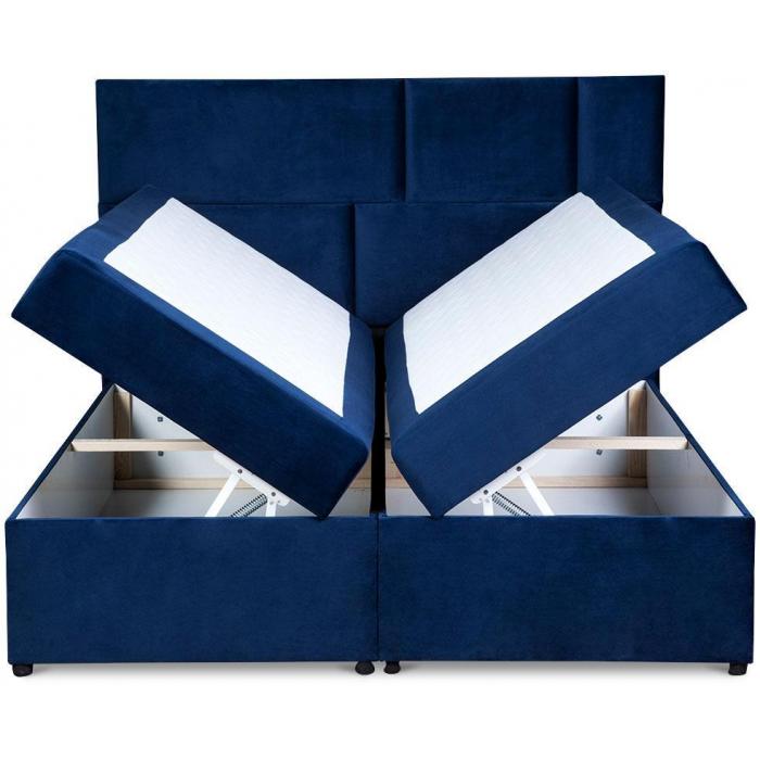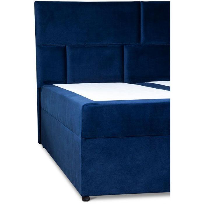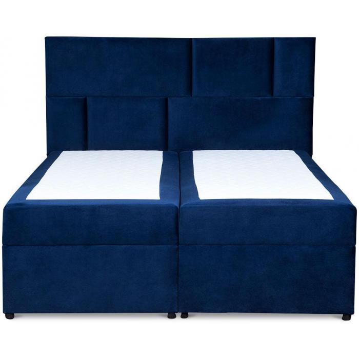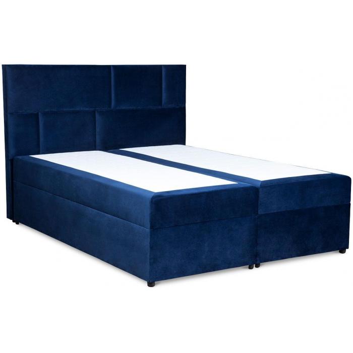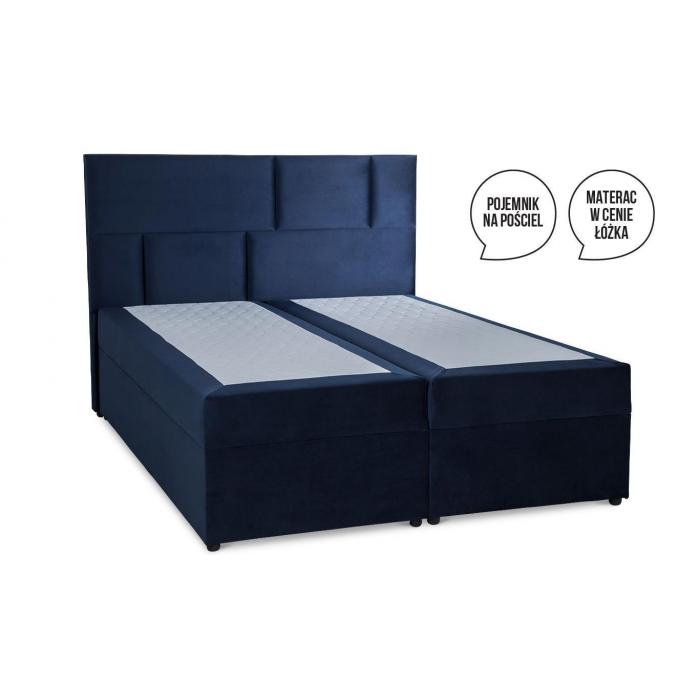 Łóżko kontynentalne Freya składa się z dwóch skrzyń oraz zagłówka. Skrzynie jak i zagłowie wykonane są z drewna oraz płyty wiórowej. Obie skrzynie wyposażone są w pojemnik na pościel z automatem wspomagającym rozkładanie. W materacu znajdują się sprężyny bonellowe oraz pianka. Łóżko tapicerowane tkaniną Riviera w kolorze granatowym. Ozdobne zagłowie tworzy elegancki i współczesny design. Powierzchnia spania wynosi 160x200 cm.