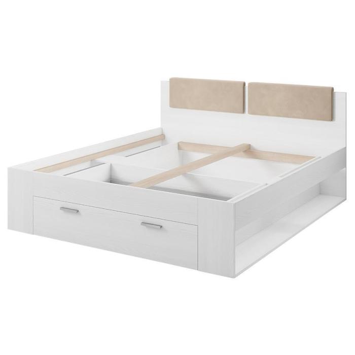 Głównym elementem wyróżniającym to łóżko jest białe, tapicerowane zagłowie, które nie tylko podnosi walory estetyczne, ale także zapewnia wygodne oparcie podczas odpoczynku czy czytania książki. Tył zagłowia wykonany jest z laminowanej płyty wiórowej, co dodatkowo wzmacnia konstrukcję.