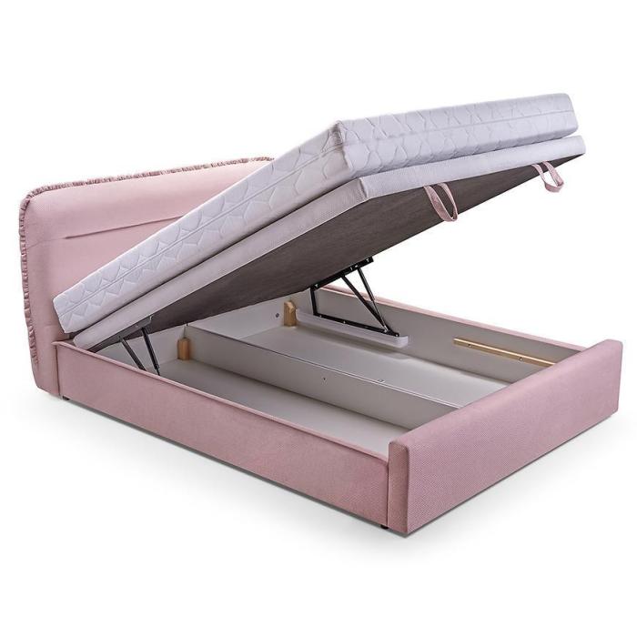 Ozdobne zagłowie tworzy ciekawy design, który wpisze się w niejedną sypialnie. Kolor różowy nada eleganckiego i oryginalnego wyglądu. Powierzchnia spania wynosi 160X200.