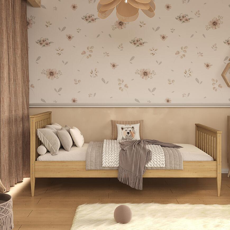 Model o wysokości 87 cm, szerokości 180 cm oraz głębokości 80 cm został zaprojektowany tak, aby zapewnić wygodę snu i jednocześnie nie przytłaczać wnętrza. Naturalne wybarwienie drewna dobrze komponuje się z białymi meblami, pastelowymi dodatkami oraz tekstyliami w odcieniach beżu i szarości.