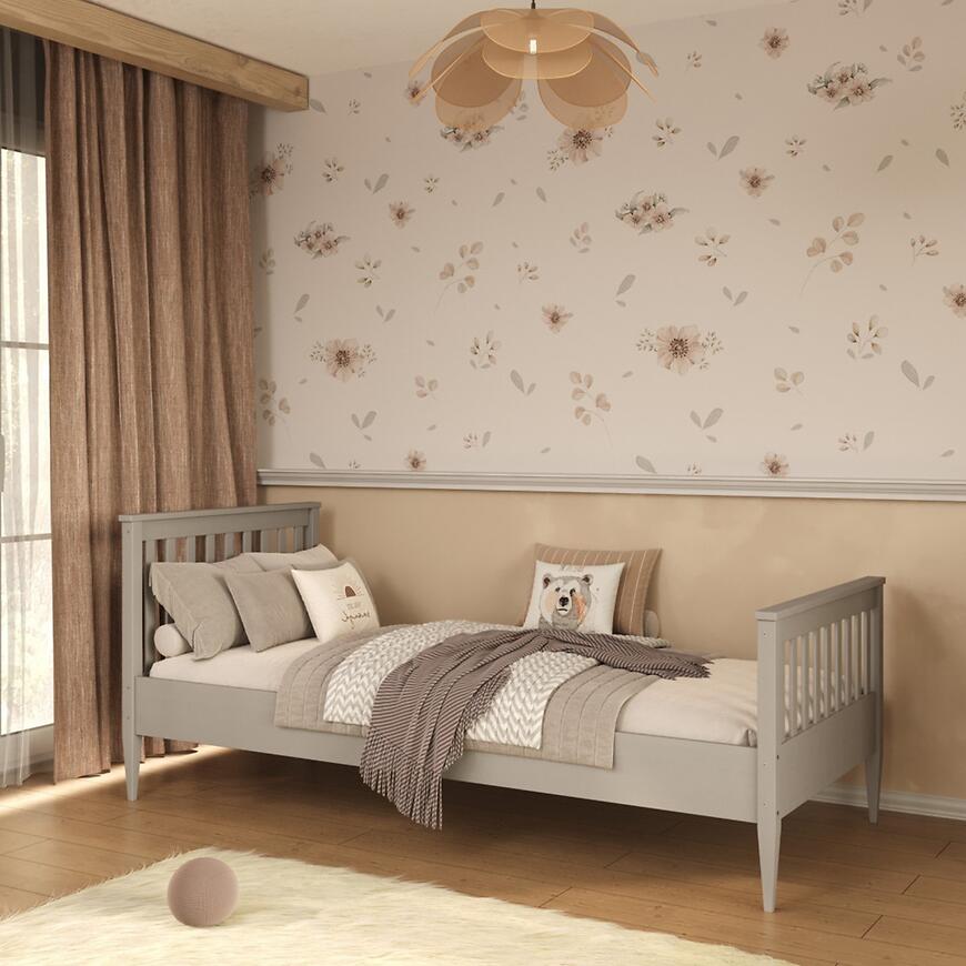 Łóżko Ignaś z kolekcji IGNAŚ to solidne i estetyczne drewniane łóżko jednoosobowe, które doskonale sprawdzi się w pokoju dziecięcym, młodzieżowym oraz w mniejszych sypialniach. Szare wybarwienie w matowym wykończeniu nadaje bryle nowoczesny i stonowany wygląd, dzięki czemu mebel łatwo dopasować do różnych aranżacji wnętrz. Prosta konstrukcja oraz drewniany tył zagłowia podkreślają trwałość i spójny design całego modelu.